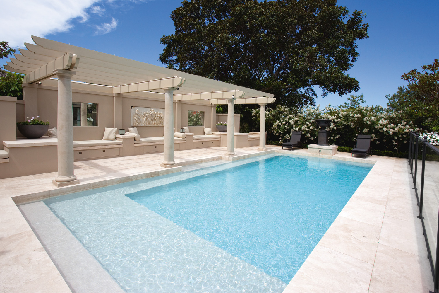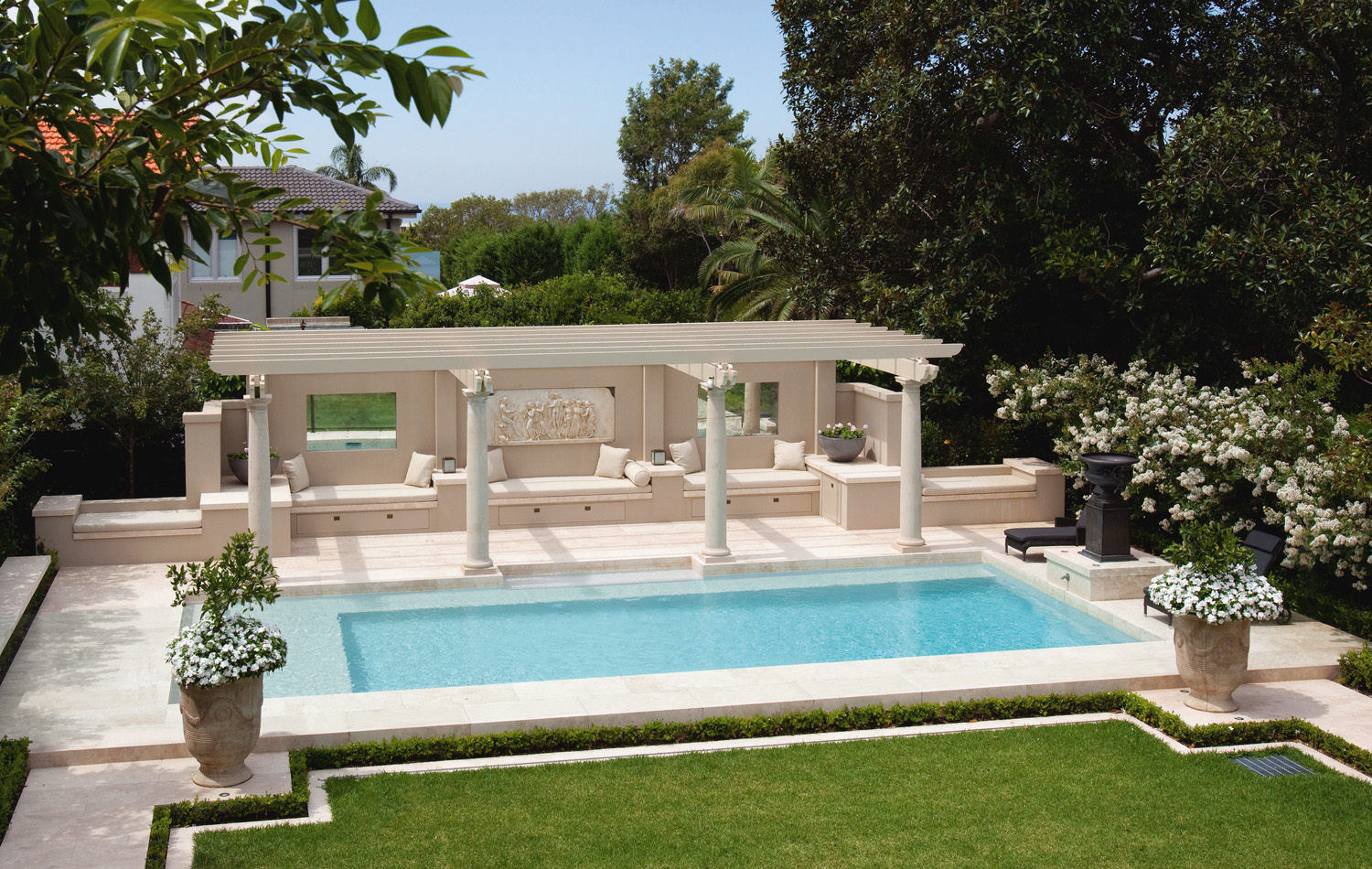 This impressive pool embodies the opulent baths of the Roman Empire. Everything about this pool oozes elegance, from the clean structured lines to the luxurious day beds and the strong pillars.