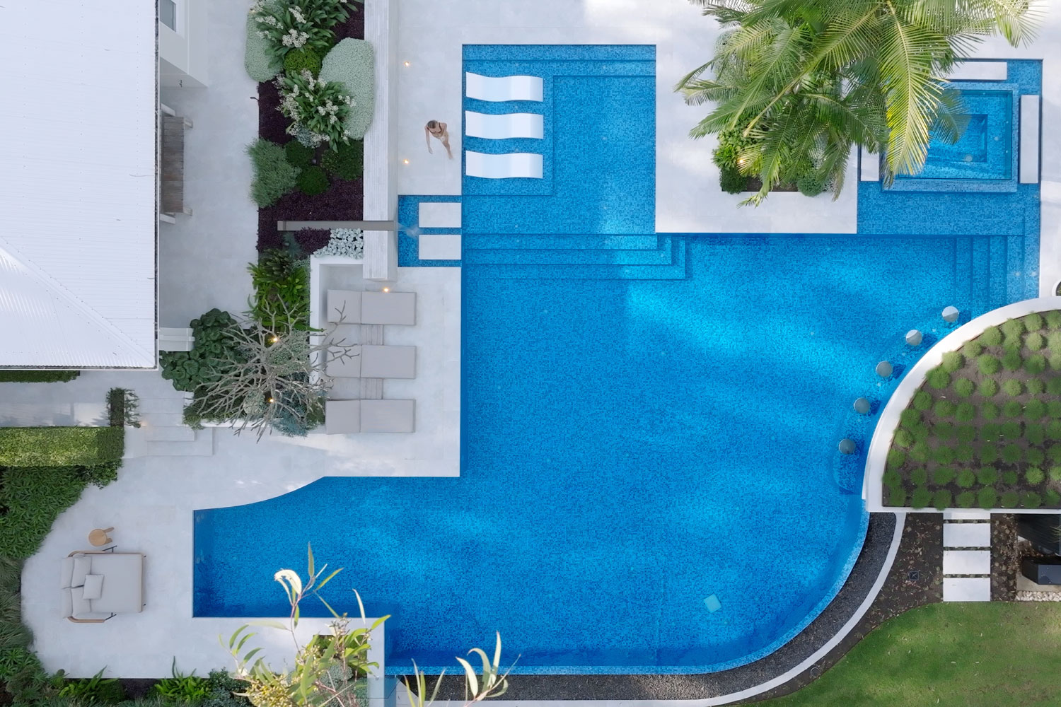 From the outset, the brief was clear: create a resort-style environment that could flex with the owners’ lifestyle. With adult sons and a busy professional life, the clients wanted a place to decompress, entertain friends and enjoy time together. The solution is a multi-zoned poolscape complete with spa, swim-up bar, shallow lounging areas and in-water lounges — each element carefully considered for comfort and flow.