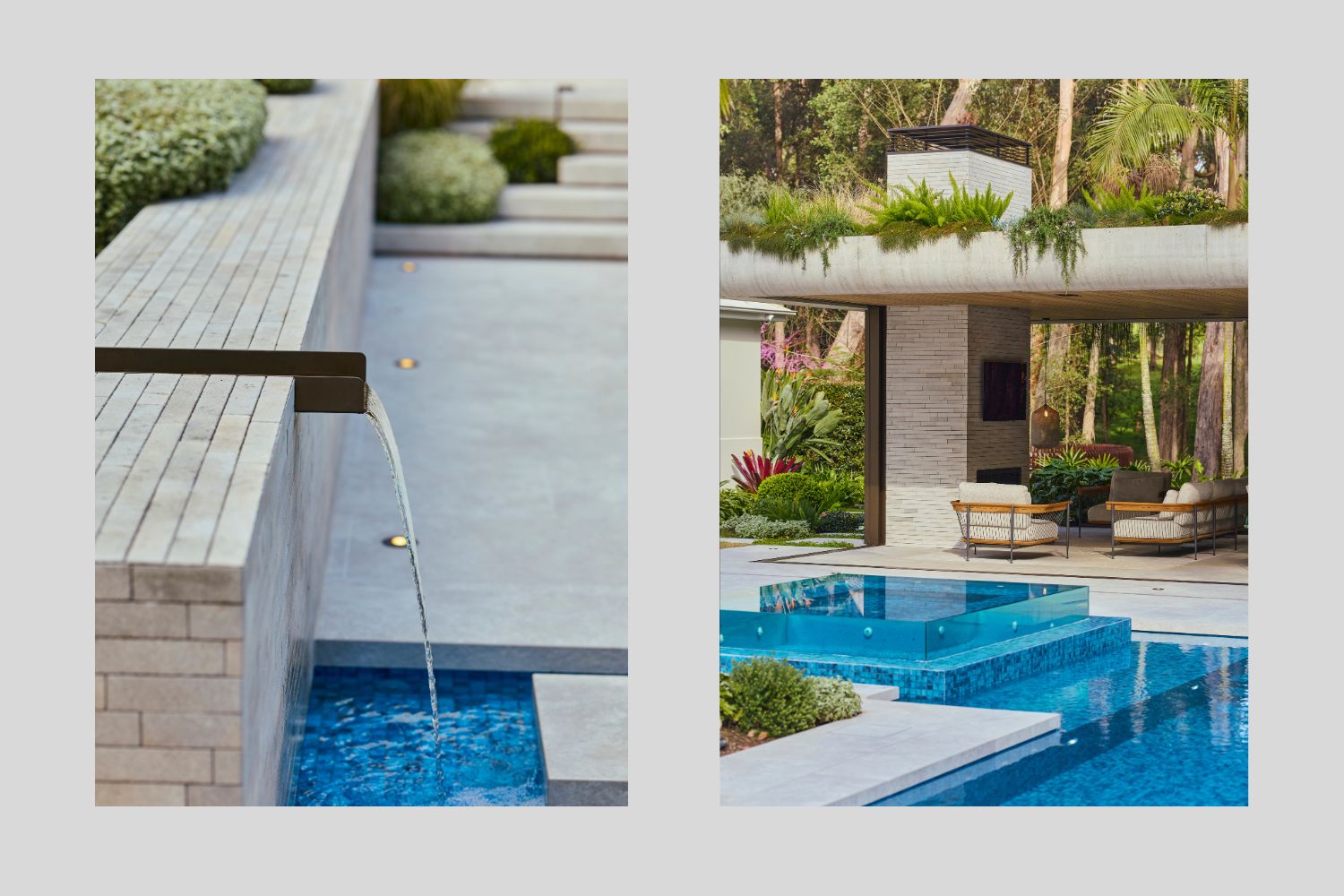 The site’s natural fall became a design advantage rather than a constraint. An infinity edge draws the eye outward, while elevated gardens and a striking stone blade wall introduce structure and movement through subtle water features. Planting in and around the pool breaks up linear paving lines, adding texture and a relaxed, organic feel that enhances the resort mood.