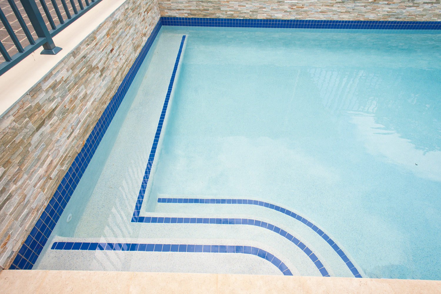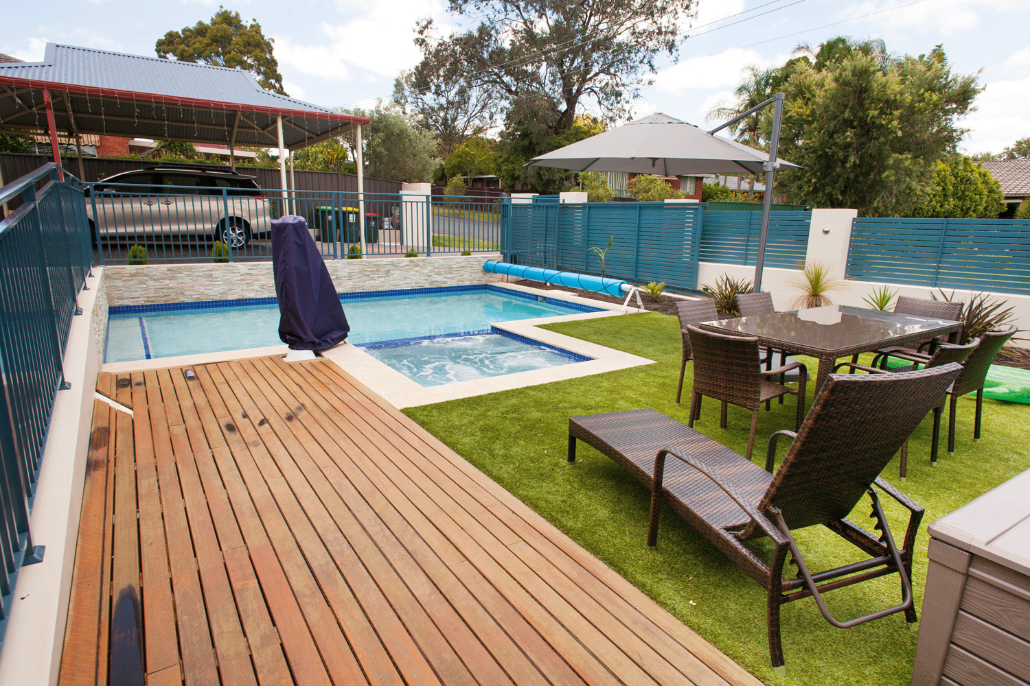 The finished structure consists of a beautiful front-yard pool and spa, situated next to the existing carport. It provides a focal point for guests arriving at the property and serves the needs of the family. The design of the pool and spa area was meticulously developed by the owner, with the aim of producing something that could be used by his daughter, who has disabilities. The layout of the entire pool and especially its step entrance had to be planned and carefully thought out.