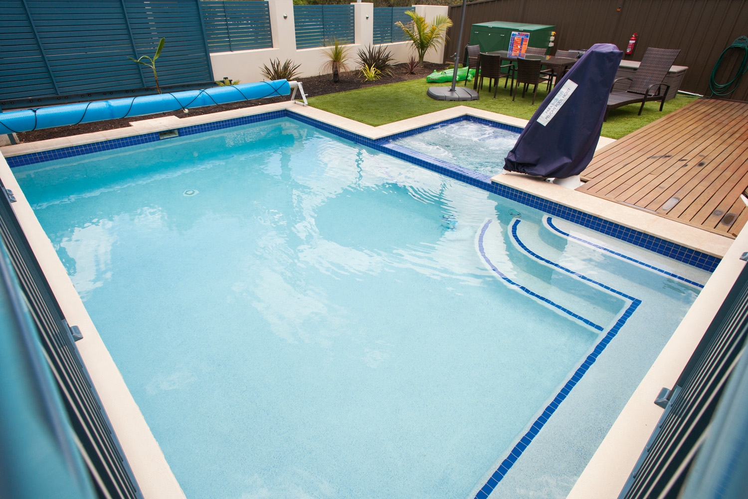 While the white interior presents a stunning spectacle during the day, the LED lights installed in the pool and spa make the area perfect for use during the night as well. The filtration system includes a Davey Silensor pump, which is an excellent addition to any pool system that is located close to the house. It enables you to have nice clean water with minimal noise.