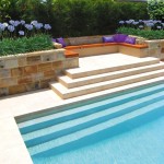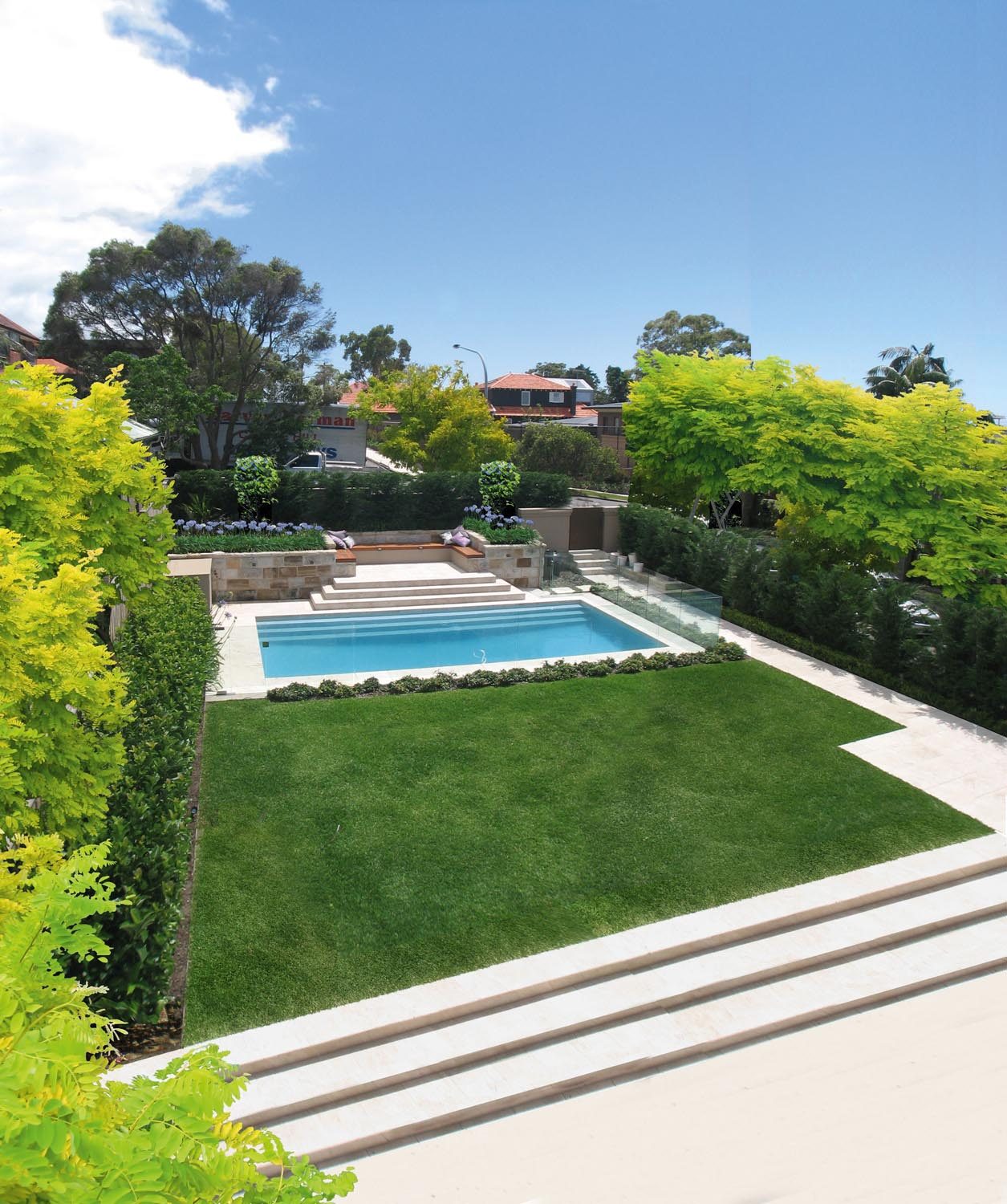 The elevated poolside entertaining terrace provides views over the swimming pool towards the residence and all features are linked together with the consistent use of blond travertine paving, painted rendered surfaces, traditional sandstone walls and a consistent planting style. The elevated paved entertaining terrace incorporates stunning timber daybeds so that adults can lounge and relax while supervising children in the swimming pool, and once finished swimming the children can entertain themselves on the broad poolside steps.