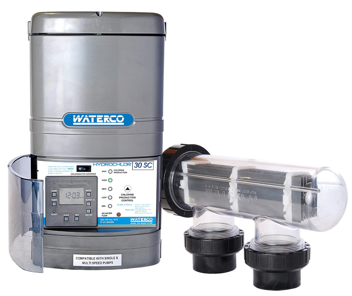A Waterco salt water chlorinator consists of a power pack (to supply power to the cell) and a Salt Cell (where chlorine is produced).
