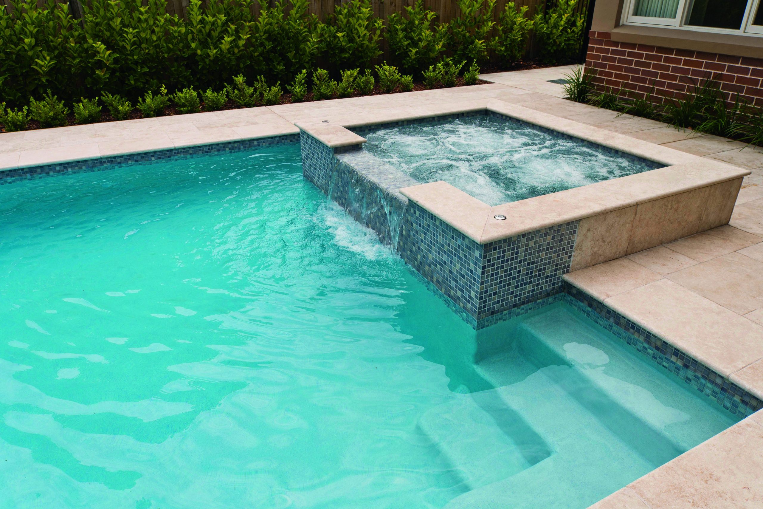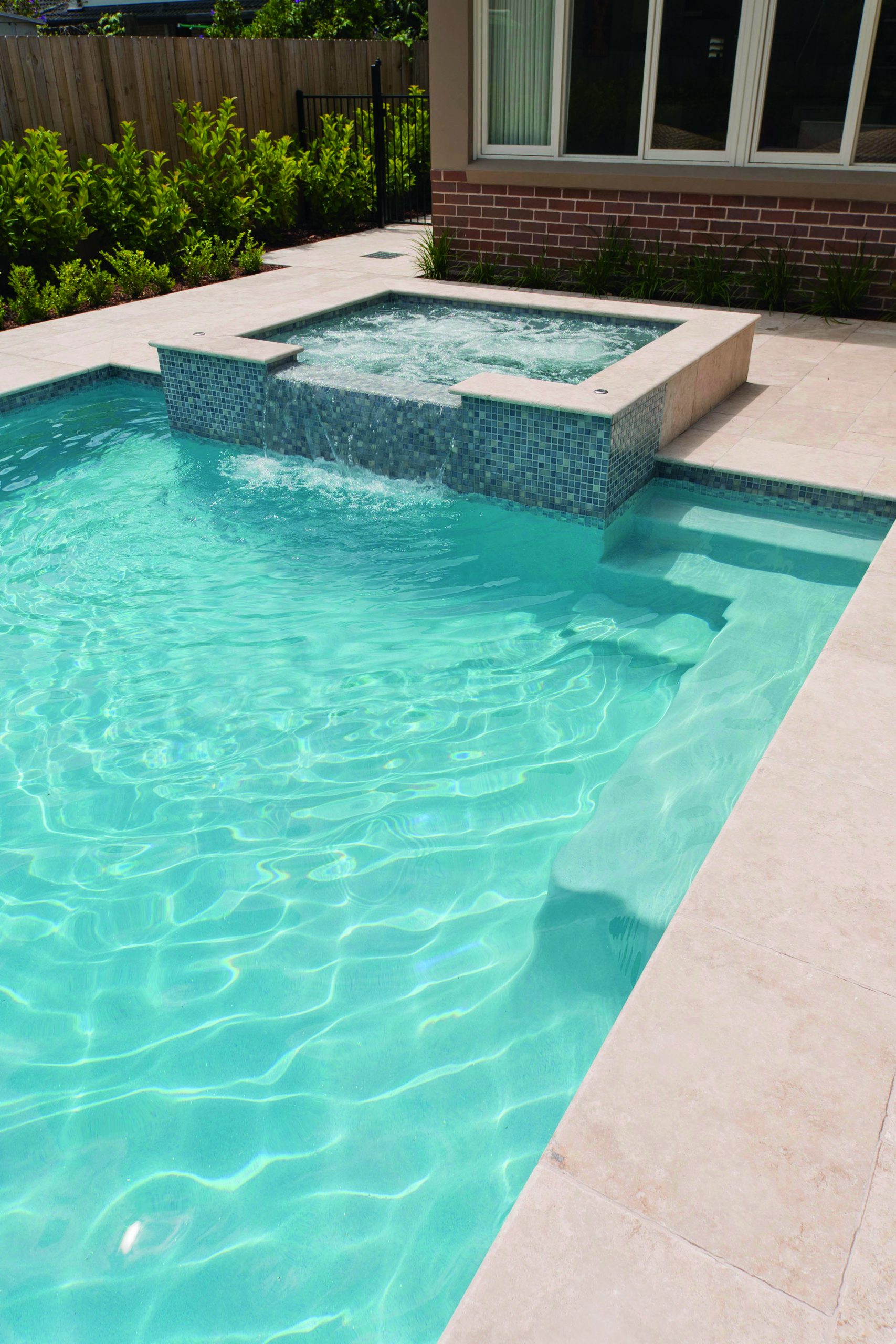 Like the warm sparkling water of a tropical island, the ice blue interior of this pool design by Freestyle Pools beckons year round. A family-sized pool and spa designed to be incorporated into a child friendly backyard was the request given by the clients, with spectacular results. Smoke blend mosaic tiles in the spa and a waterline finish for the pool add points of interest and individuality to this custom design.