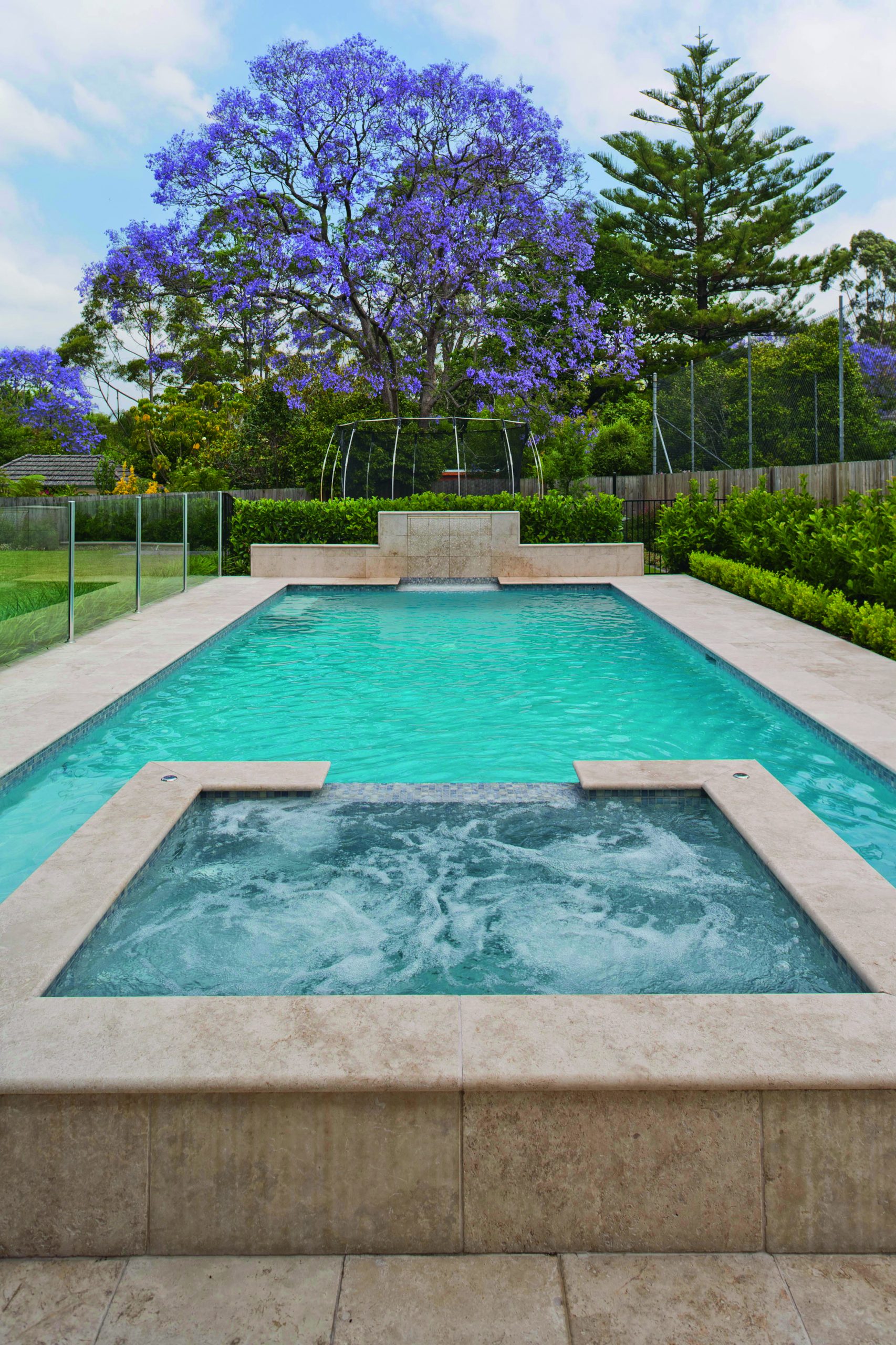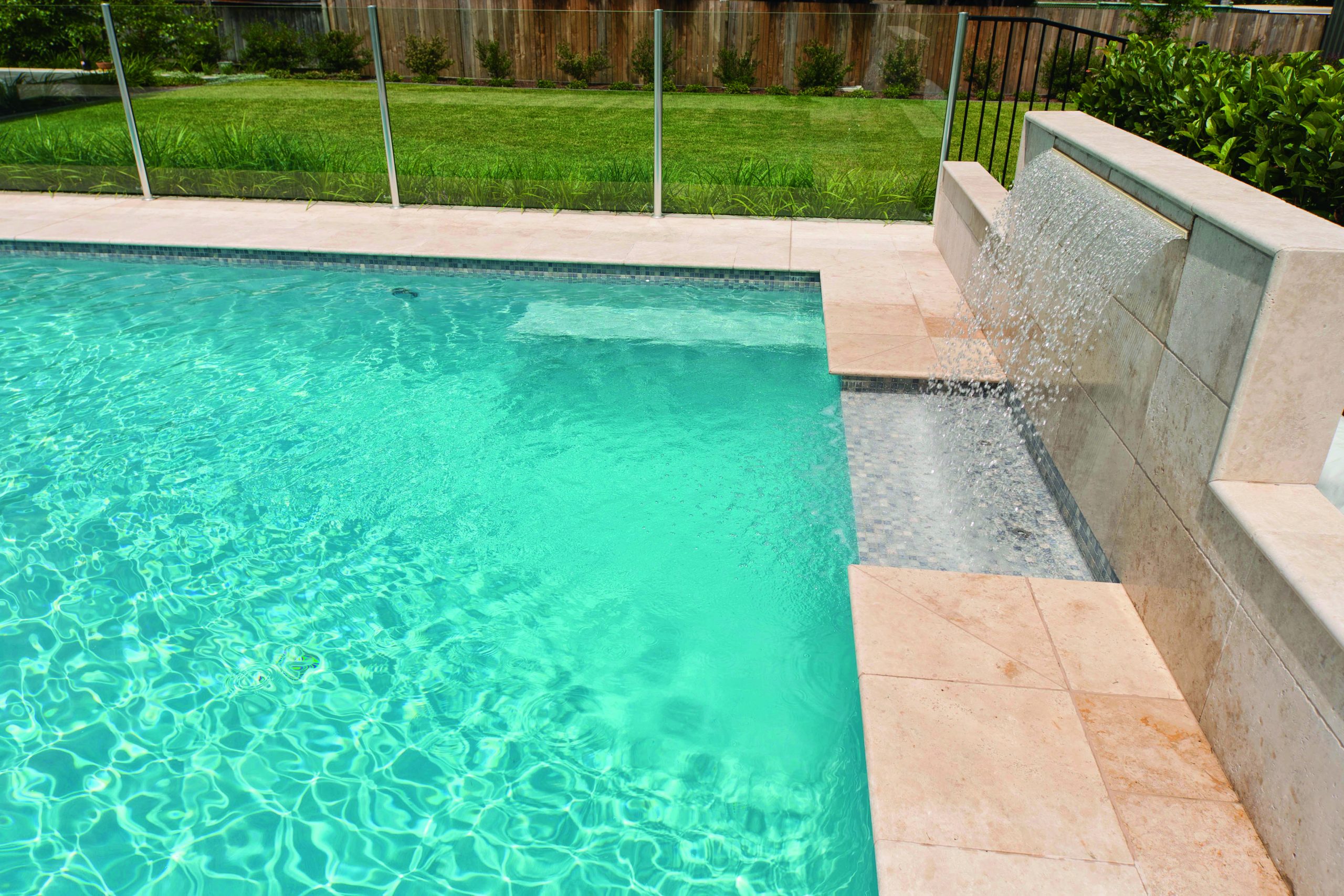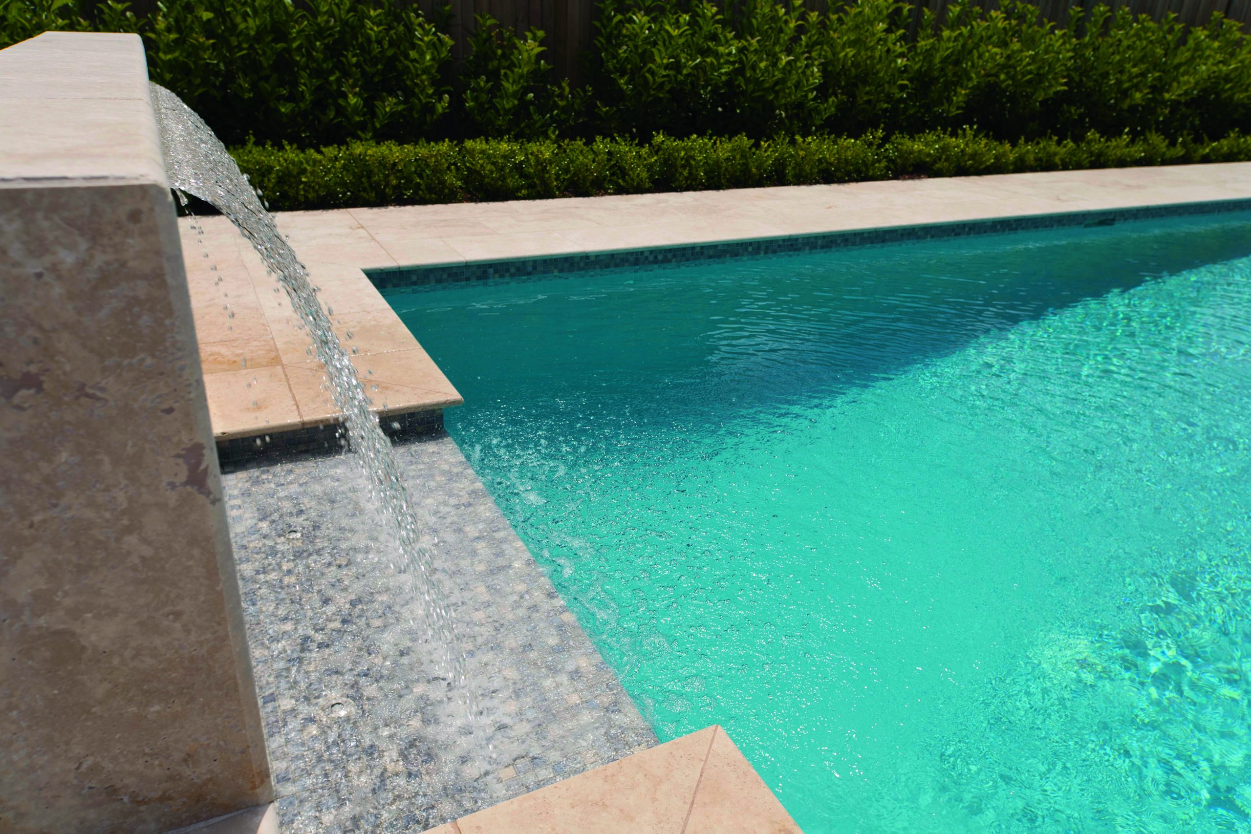 The use of travertine stone surrounds in the pool area accentuates the overall cohesion between the home and outdoor areas, a balance that was a high priority in the design of this pool. LED lighting in both the pool and water feature creates the ambience and functionality for night-time swimming and entertaining and Viron natural gas heating keeps the pool warm despite the weather.