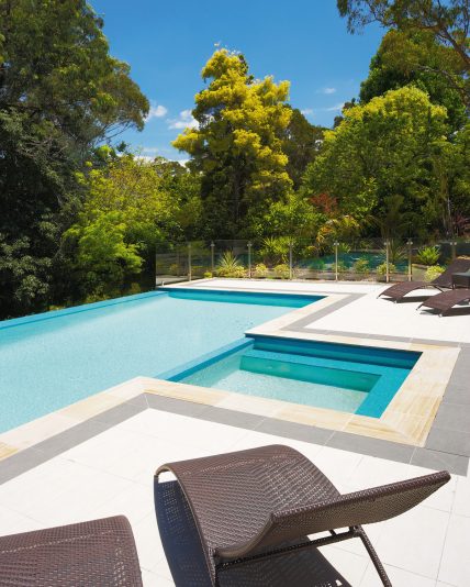 Entry steps are located on the left-hand corner of the pool, and the infinity edge is fitted with sky-blue and aqua-coloured mosaic tiles, as is the wall separating the spa, allowing the water to sparkle in reflection of the sun. The surrounding garden, viewable through the glass fence, is landscaped with tan bark and native plants, rendering that truly Australian, rustic scene.