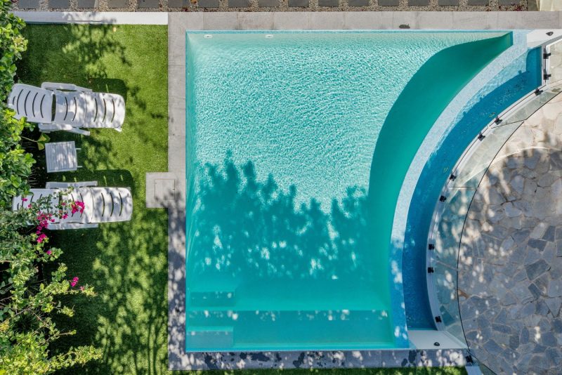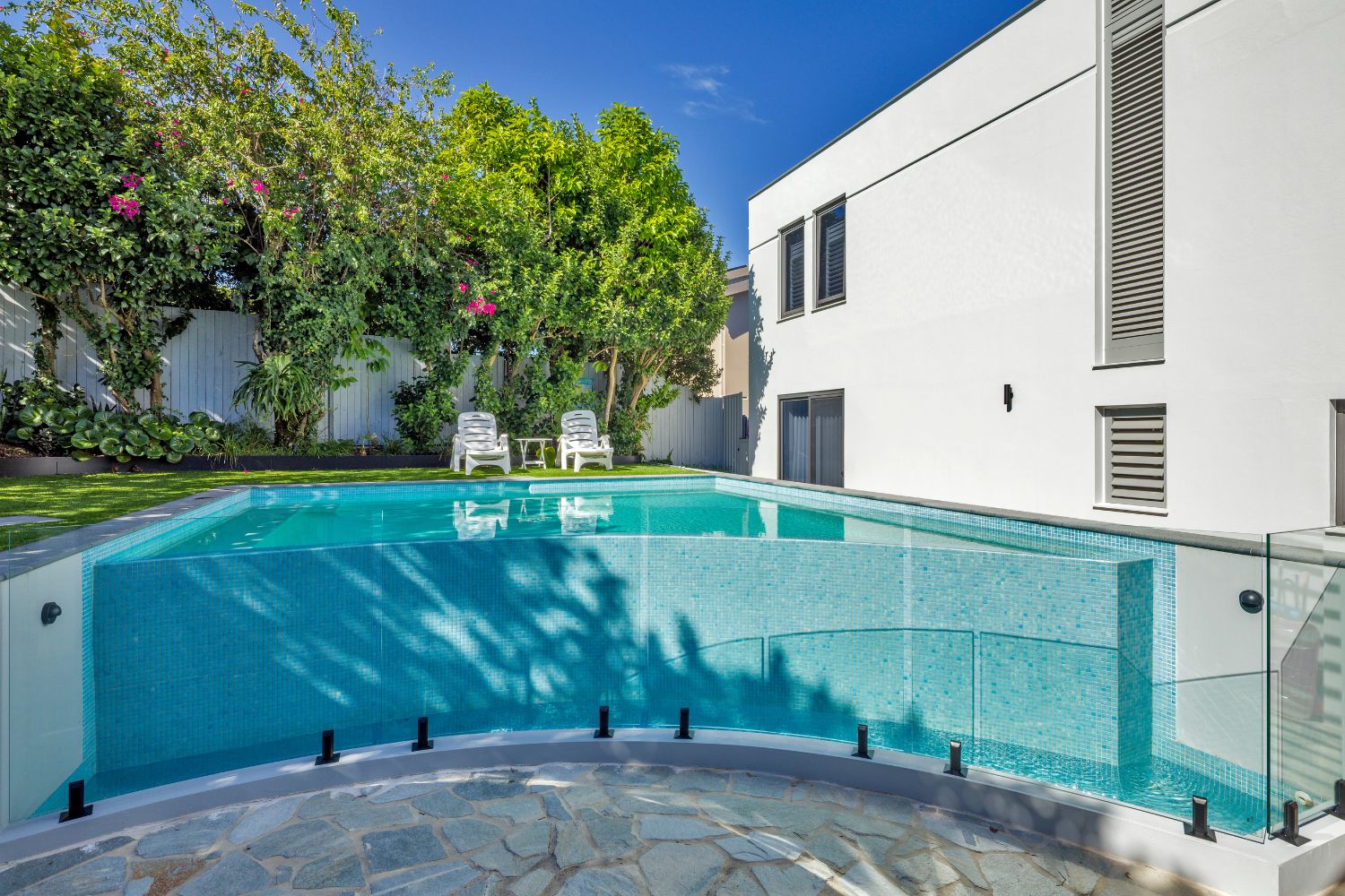 Featuring an infinity wet edge paired with frameless glass fencing, the pool delivers a tranquil water-on-water effect that enhances the sense of openness and flow throughout the backyard. The glass fencing allows uninterrupted views across the curved infinity wall, reinforcing the feeling of lightness and movement while keeping safety considerations discreetly in place.
