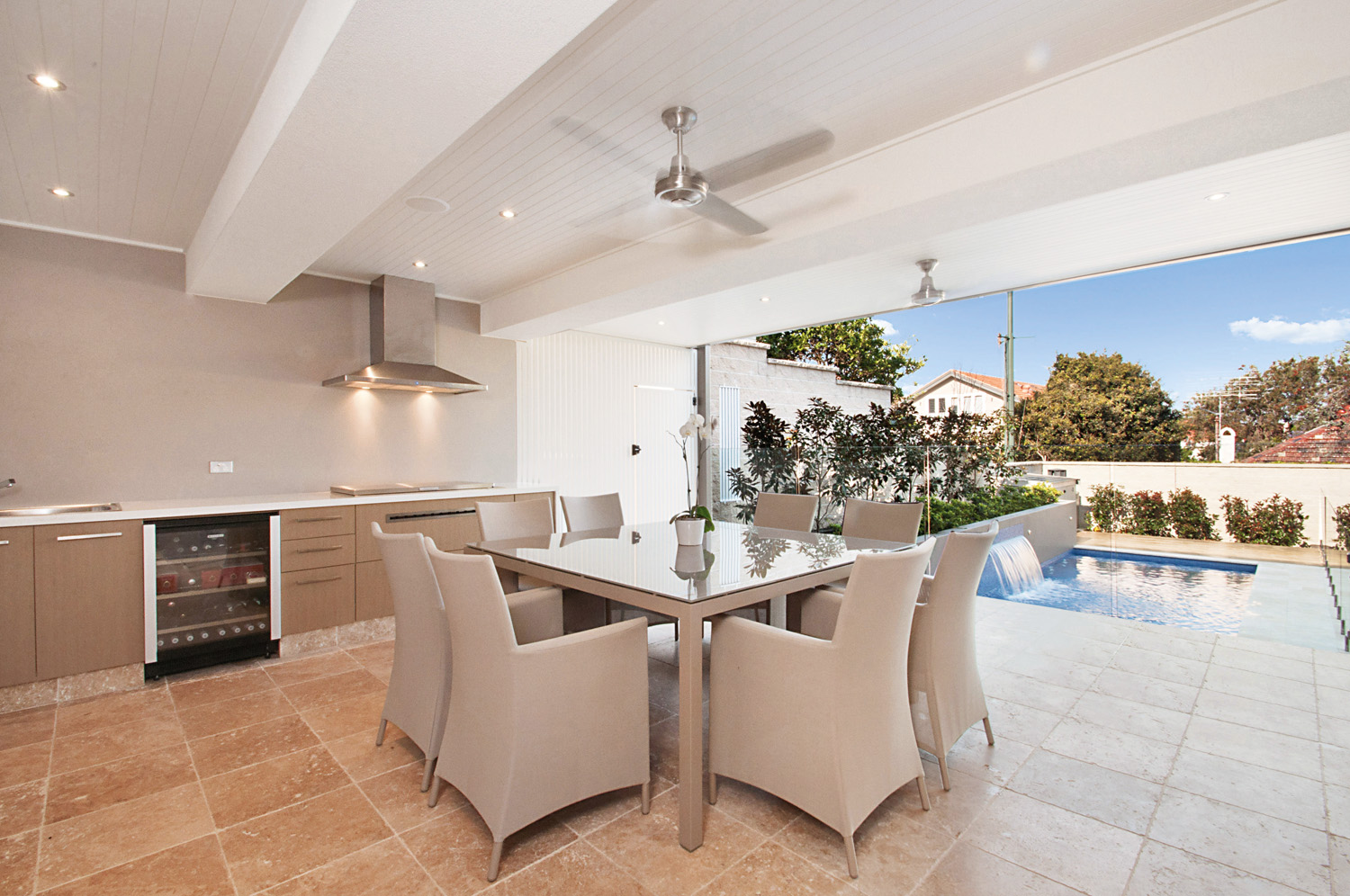 The alfresco offers an unimpeded view of the pool, allowing adults to supervise children, while at the same time, providing a perfect outlook of the entire yard. Glass fencing surrounding the pool not only fulfils safety requirements, but also enhances the uninterrupted vista.