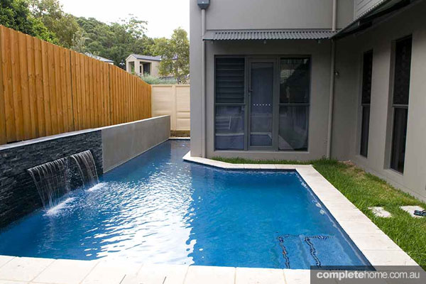 5. This clever pool design maximises the available space in this outdoor area to create a lap pool by extending a finger of the design to the full length of the yard. The slate-tiled far wall with a cascading water feature adds extra visual appeal.