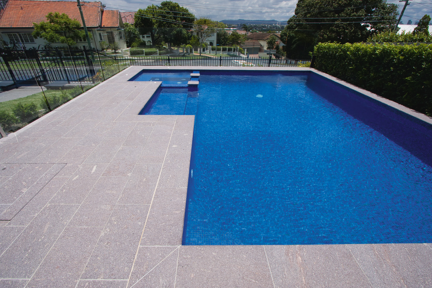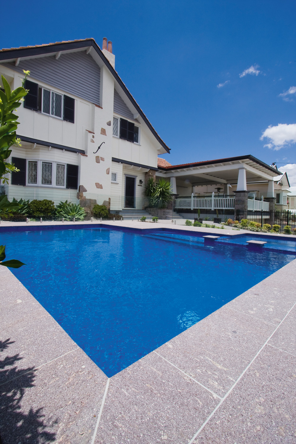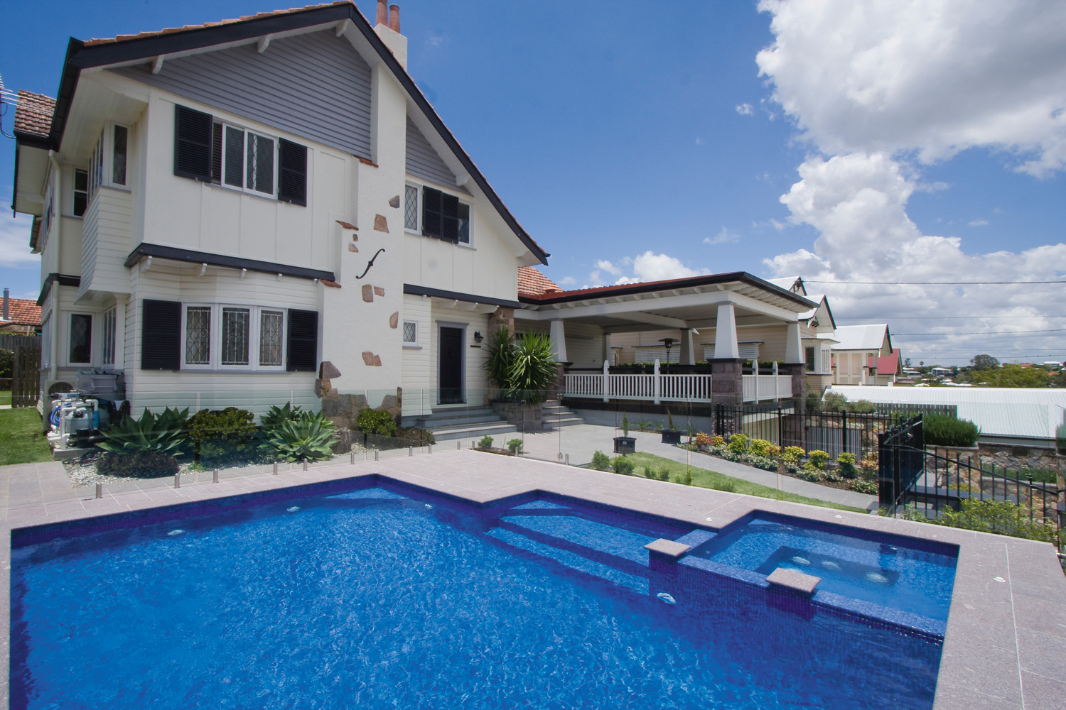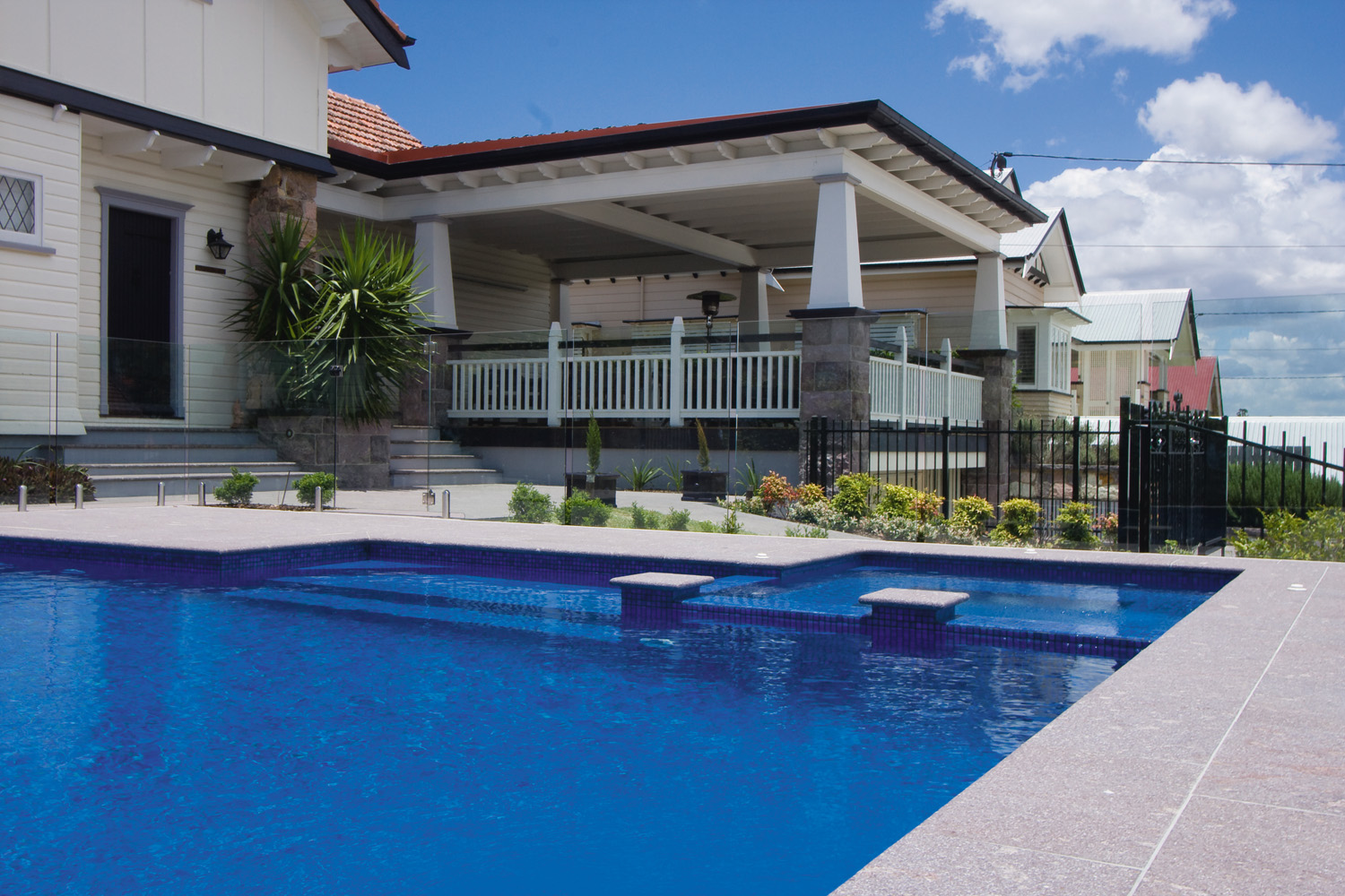 The featured pool is a stunning example of contemporary design fused with a traditional heritage-style Brisbane home. This Malibu Pool and Landscape package ties in effortlessly with the beautiful home. It emulates the natural stone coping and surrounds of the home by using the same purple stone featured in the home’s stone walkways and landings. This was chosen to assist the natural flow between spaces. The pool and spa incorporates the latest in eco-friendly technology and focuses on the fine details to create a pool area that is timeless. It is this attention to detail that makes working with Malibu Pools and Landscapes a unique experience.