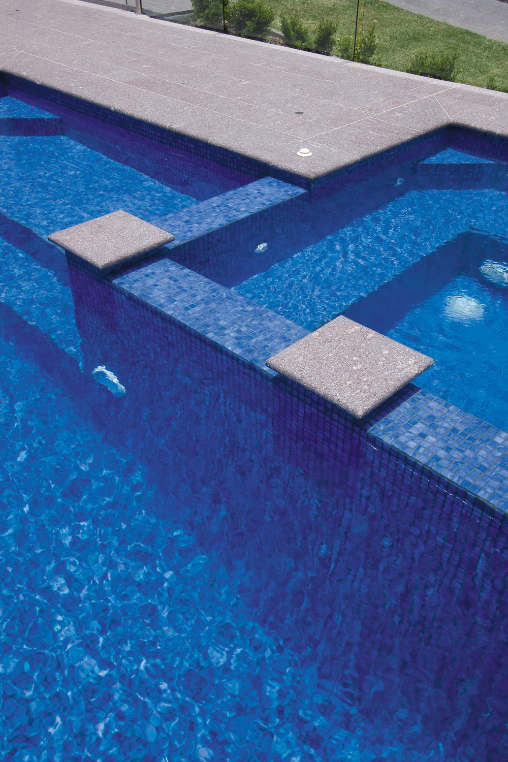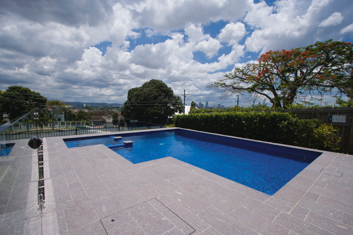 Sean Lynch worked collaboratively with the clients to ensure their ideas were being utilised and took the project from concept to completion. The client wanted a luxury outdoor living area for the family to enjoy. The wet edge was created to resonate with this primary objective. It is 2m × 2m and has 500mm play benches and stepping stones across the wet edge that appear to fall into the pool. The spa uses an electric heat pump, booster pump, in-floor cleaning to ensure easy maintenance, massage therapy jets and blower lines that create the ultimate zone for relaxation while remaining entertaining for children and guests.