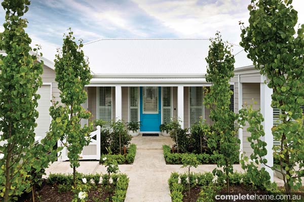 Of modern formal design, the individual courtyards and outdoor spaces, all of which were built by Bayon Gardens, that surround the home feature carefully considered planting schemes which provide shade in summer and allow natural light to flood the home in winter. The front-garden layout is formal, yet the planting is quite relaxed. Along the fence line, Teddy Bear magnolias soften the change of levels, ornamental pears are used as feature trees, and ficus form an informal hedge in front of the house. These plantings are complemented by a low English box hedge along the pathway, which adds definition to the design.