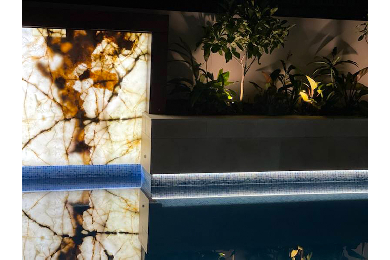 The second problem that Sam identified was the pool steps, which were installed prior to Sam being involved with the project. The stairs were polished concrete and could not be effectively waterproofed, which would dramatically compromise the installation of the pool in the long-term. The third problem Sam saw was in the installation of the onyx water feature. The onyx had unique translucent properties, and the client wanted the 4m² slab to be installed with a backlight, allowing it to glow spectacularly with light. A beautiful concept, but the installation would be problematic.