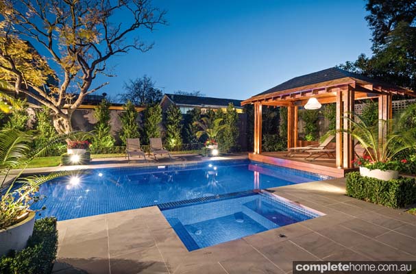 Boasting a long list of special features, including the PCC2000 in-floor cleaning system, a stunning pagoda and ample lighting, the pool can be enjoyed day and night. When discussing the design of their pool, the owners requested a family-friendly pool and spa area, suitable for both adults to entertain in and teenagers to enjoy. The design by David Franklin incorporates a pool and a spa in one uniform design.