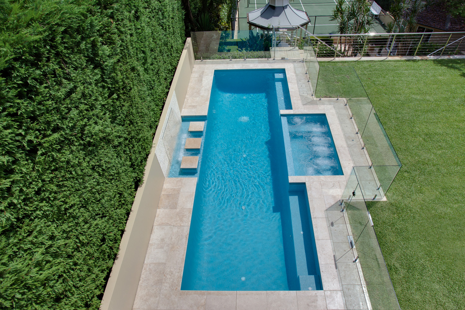 In contrast to the previous pool, which was somewhat out from the boundary, this new instalment sits right up against a large perimeter hedge. It provides plenty of adjacent lawn space, as was required. Being located against the hedge does not detract from the pool’s exposure to the sun, meaning it can still maintain a comfortable temperature in the summer. This, accompanied by the in-built heating system, allows the level backyard to be more useful, without reducing the usability of the pool.
