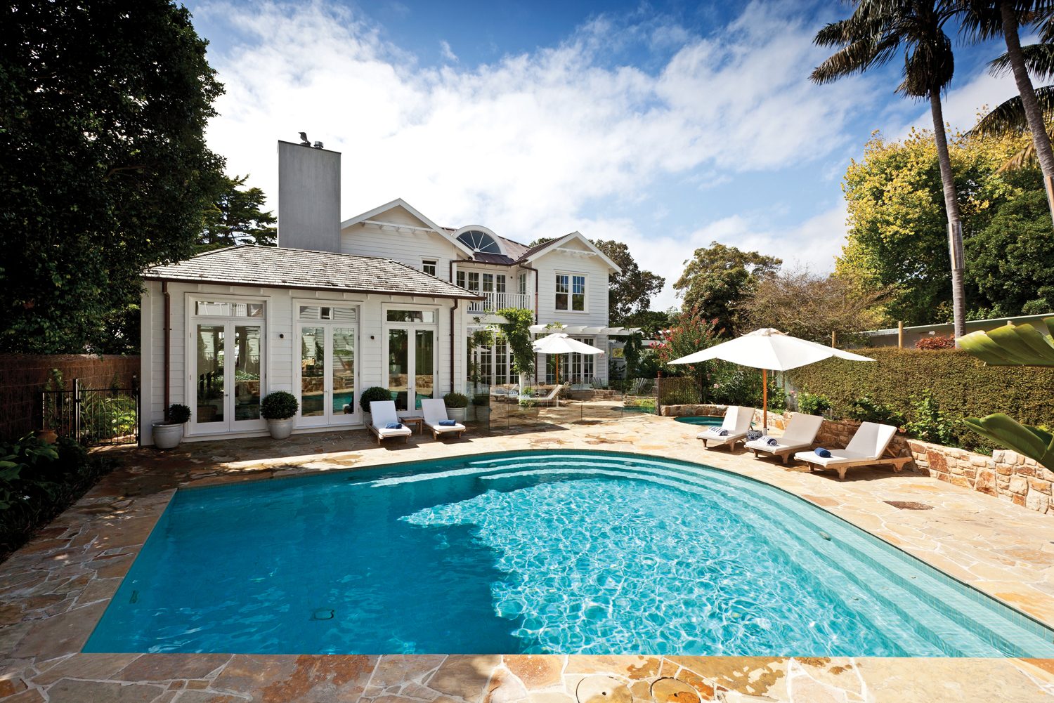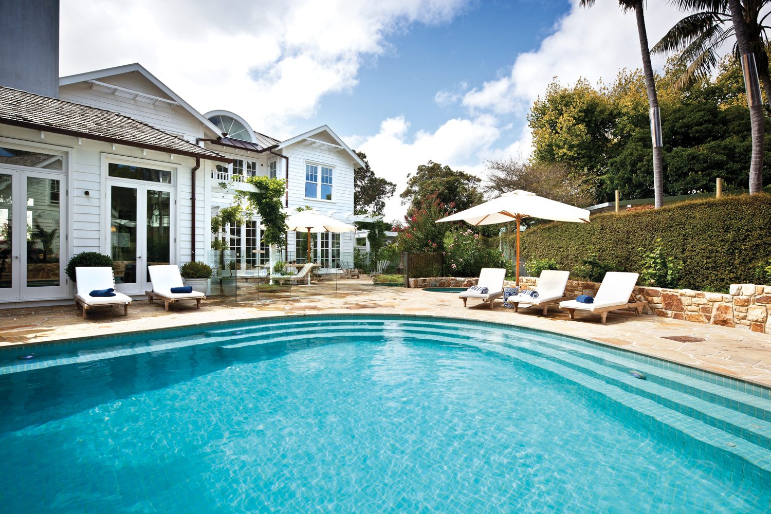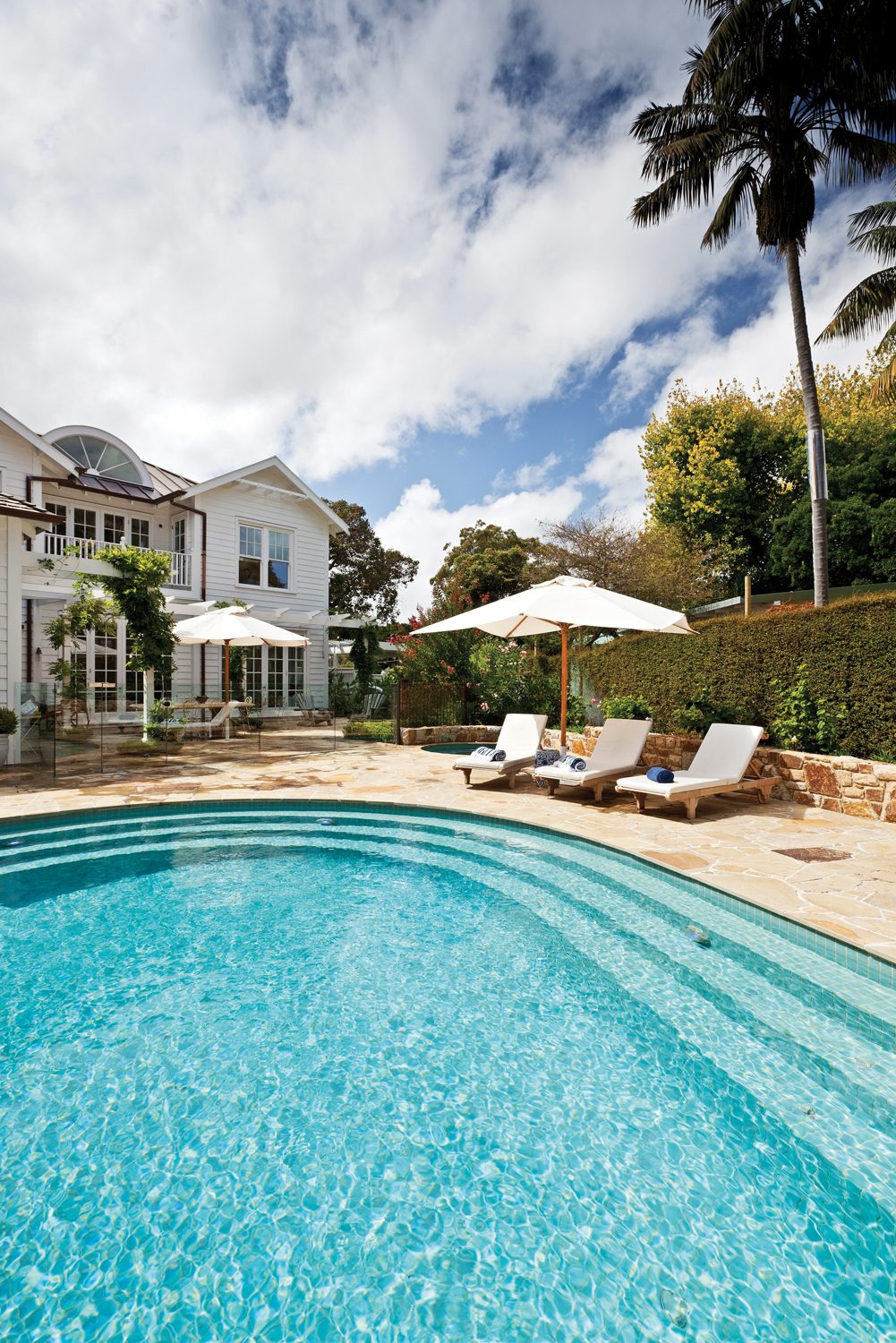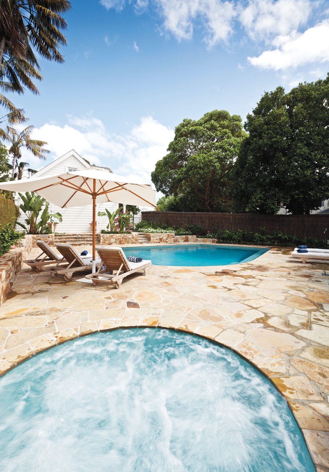 Designed to complement an irregular block, this unique creation is a collaboration between landscape designer Robert Boden of Robert Boden Design P/L, Aquarius Pools and the clients. With the clever use of curved stonework to integrate the pool and spa, the design echoes the character of the owners’ house, resulting in a cohesive and stylish aesthetic.