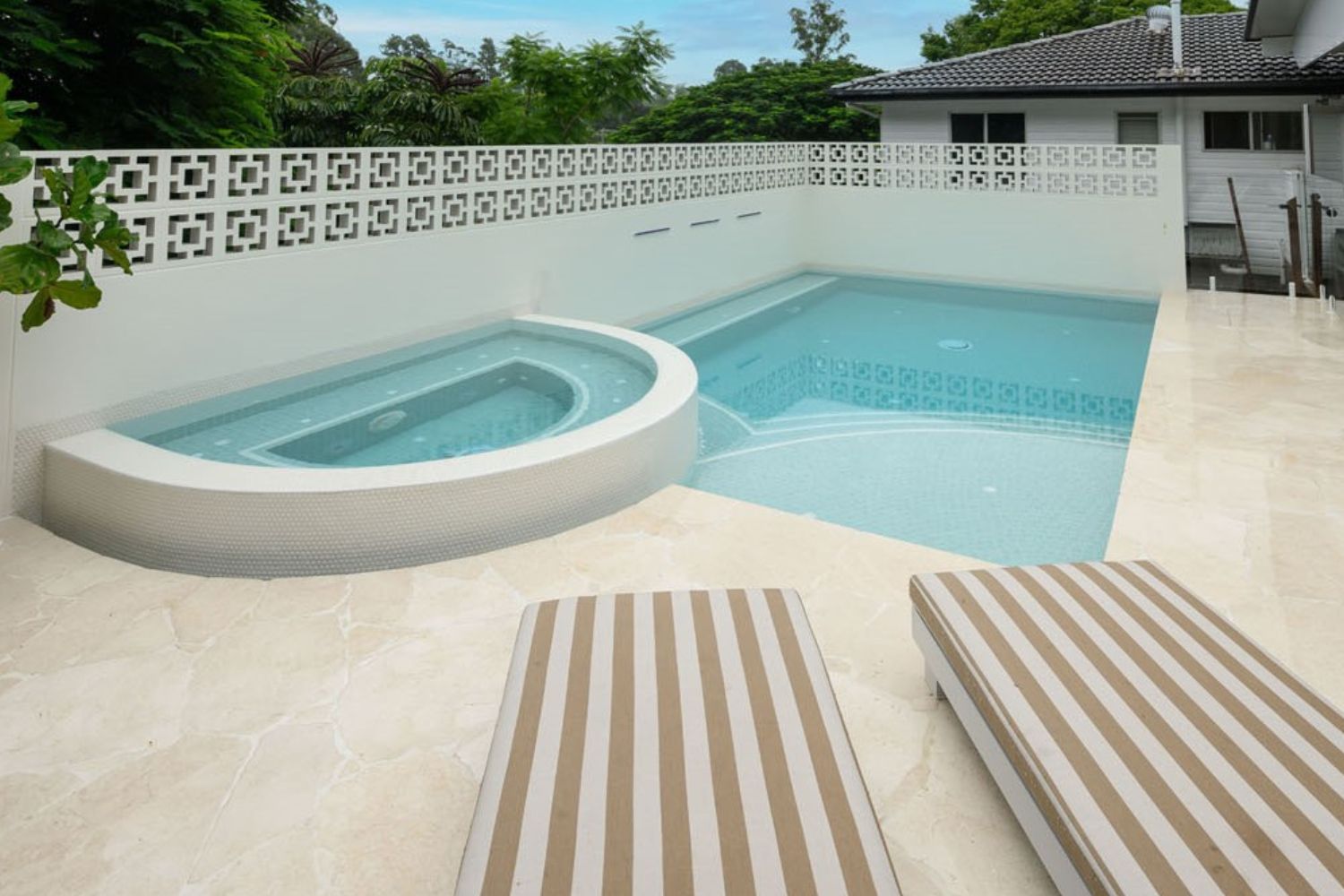 For those who prefer a modern, minimalist style, white and lightgrey pools are making a comeback. These clean, crisp colours reflect the surroundings and create a bright, airy feel in the outdoor space. Light-coloured finishes also make pools look larger and more open, ideal for smaller backyards.
