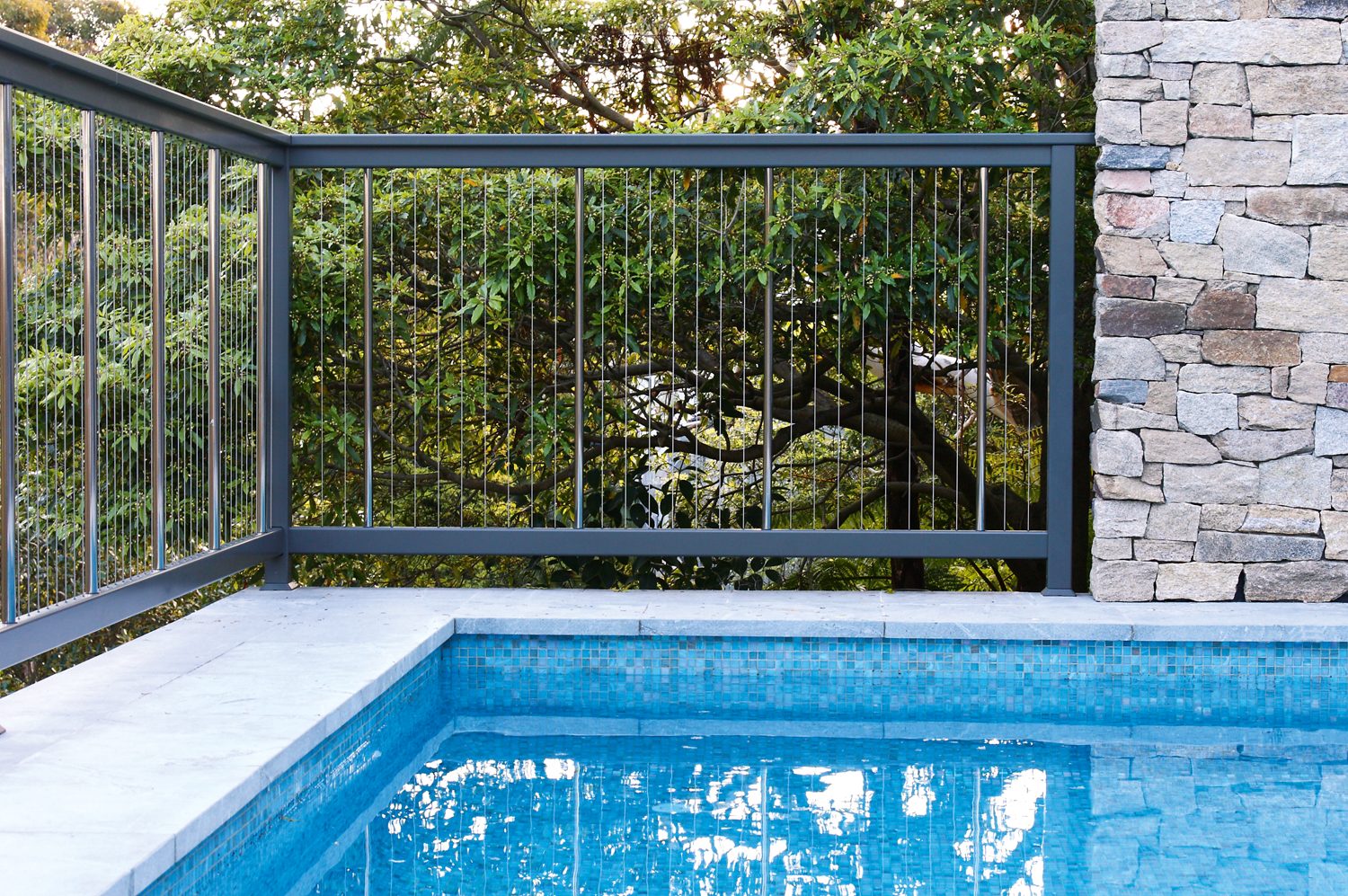 Sentrel Australia offers a unique, functional and high-quality range of vertical cable balustrades and pool fences that fit seamlessly and stylishly into most poolside spaces. The fence is made of thin, vertically orientated cables tensioned between either beautiful hardwood timber or extruded aluminium, giving a sleek finish to pool areas and natural environments.