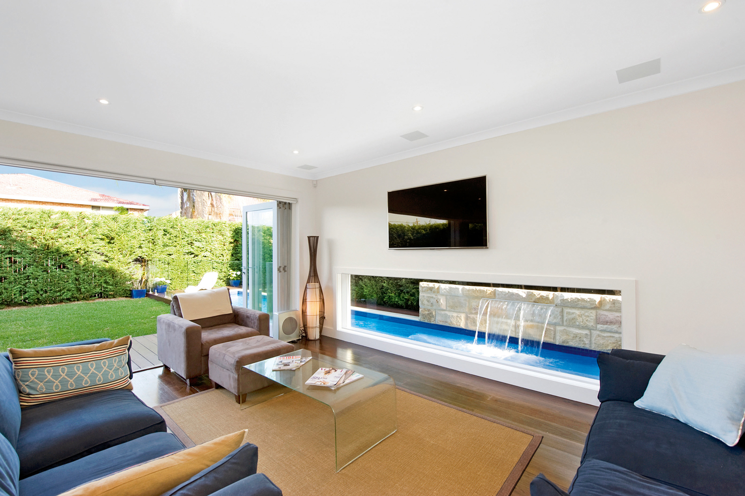 Watching the kids splash around the pool from the comfort of your couch sounds pretty cool, right? With this featured Infinity Pools project, the homeowners can keep an eye on their two young children from a feature window inside the home, which highlights the striking pool and water feature.