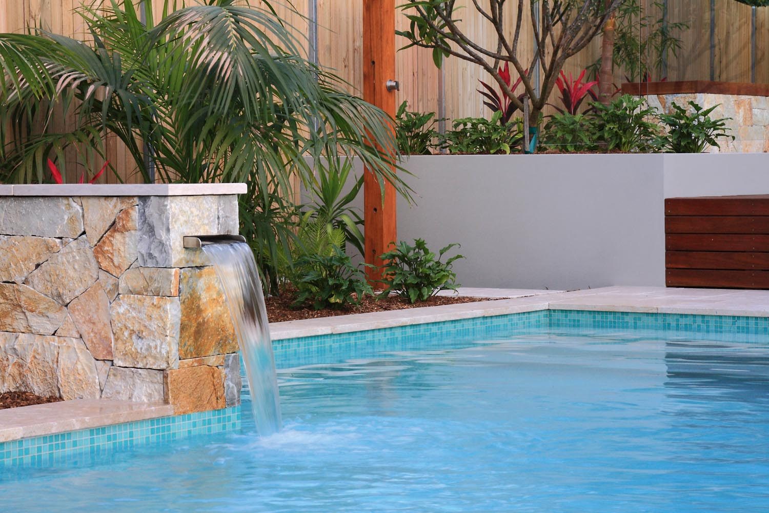 The lush garden is abundant with sturdy foliage, blending seamlessly with its poolside location. The plants are largely tropical to give the elegant poolscape a relaxing vibe. Among the beautiful elements of this carefully considered project, the water feature enables the design to strike the perfect balance between sophistication and relaxation.