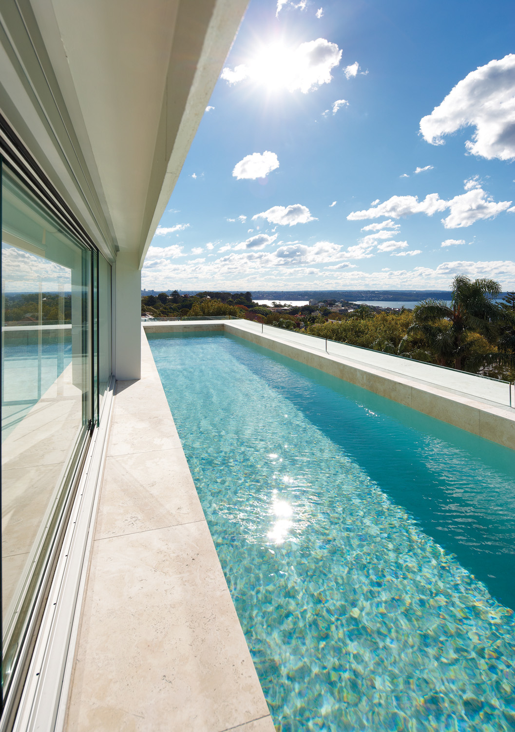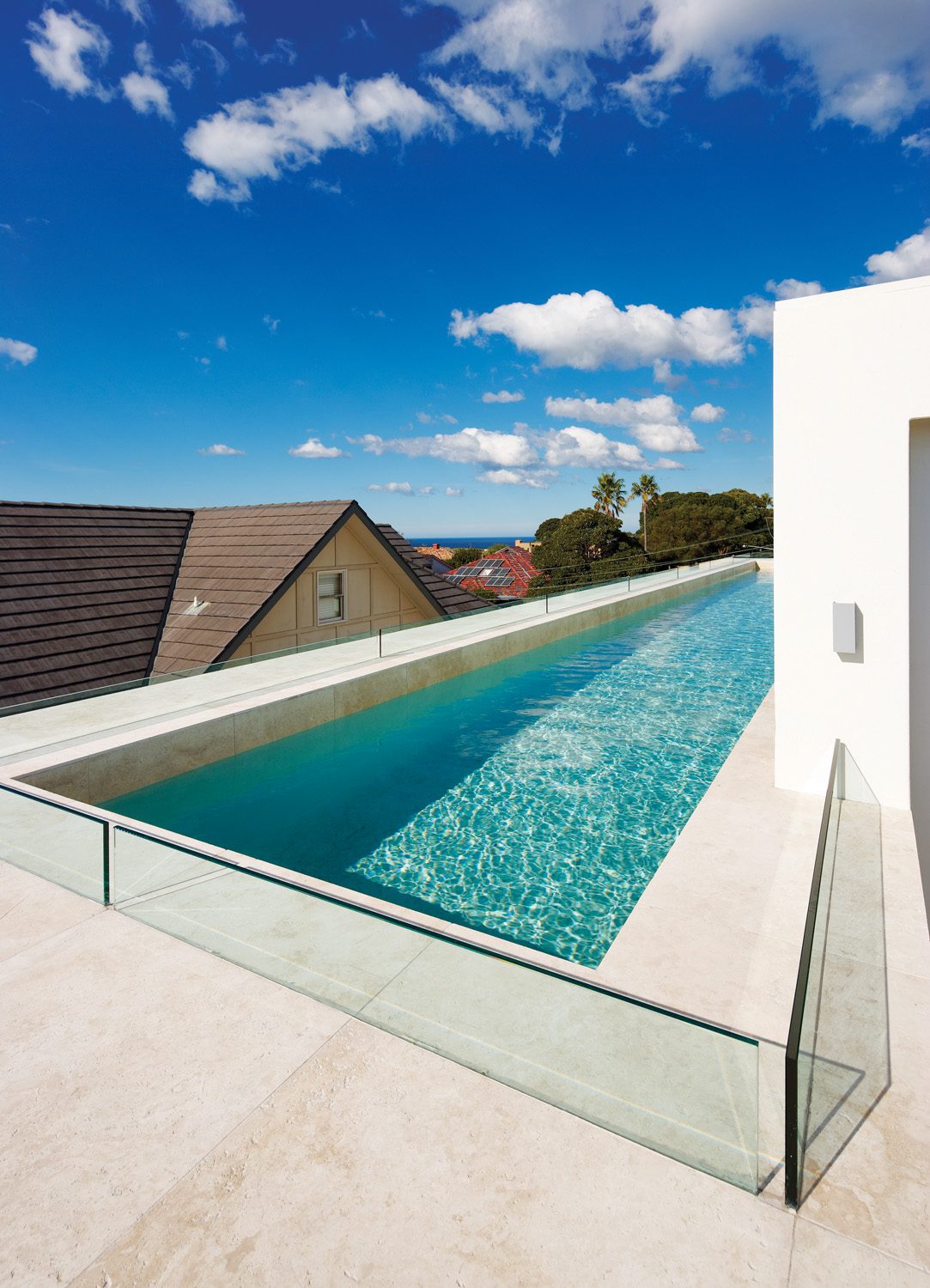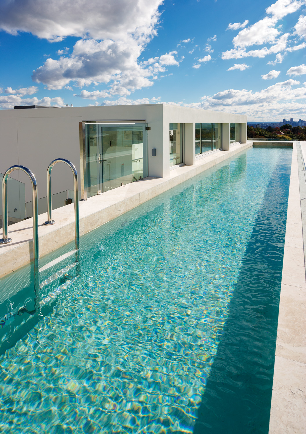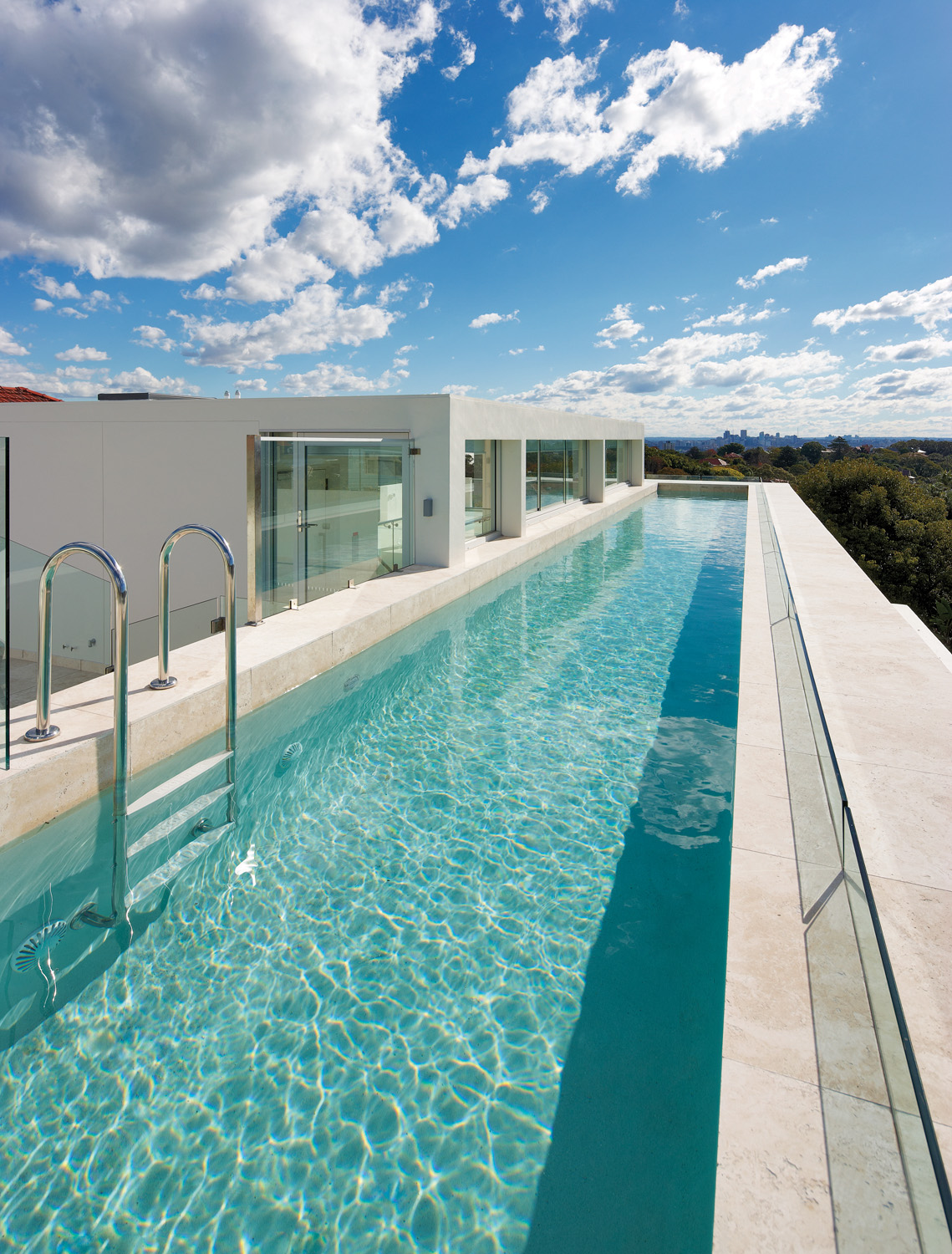 This 14m x 2.5m rooftop lap pool, built by Artesian Pools, appears to almost hang from the sky. By building the pool on the roof, the owners and their visitors can enjoy the ocean and city views from both indoors and out.