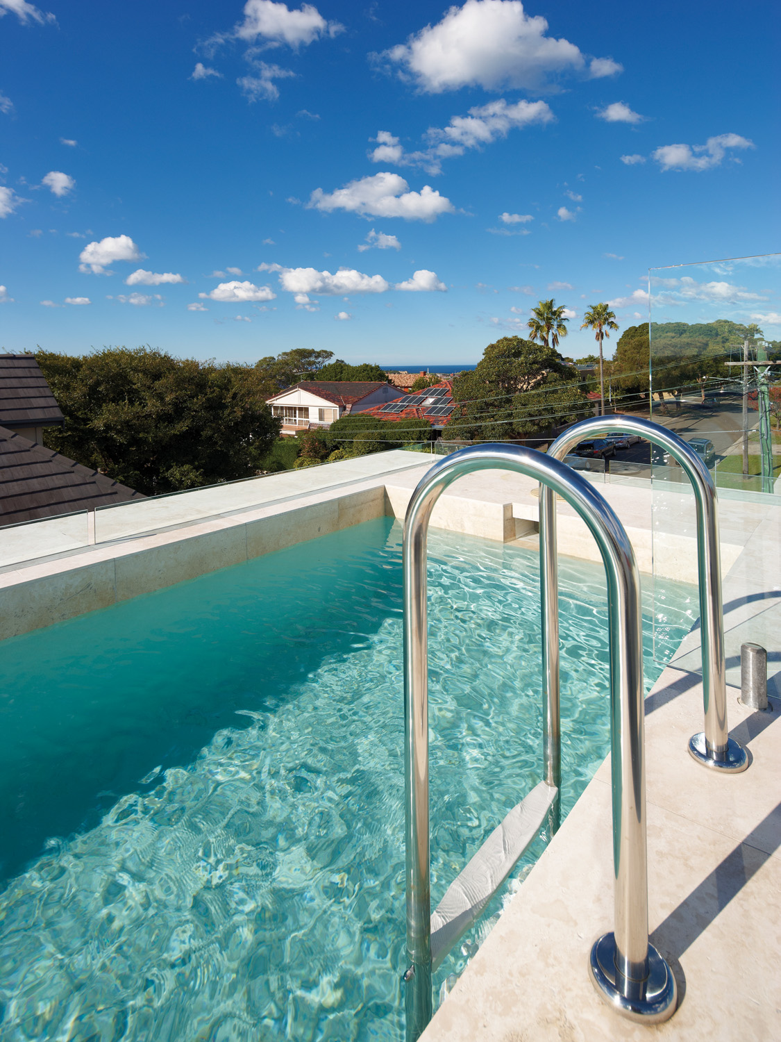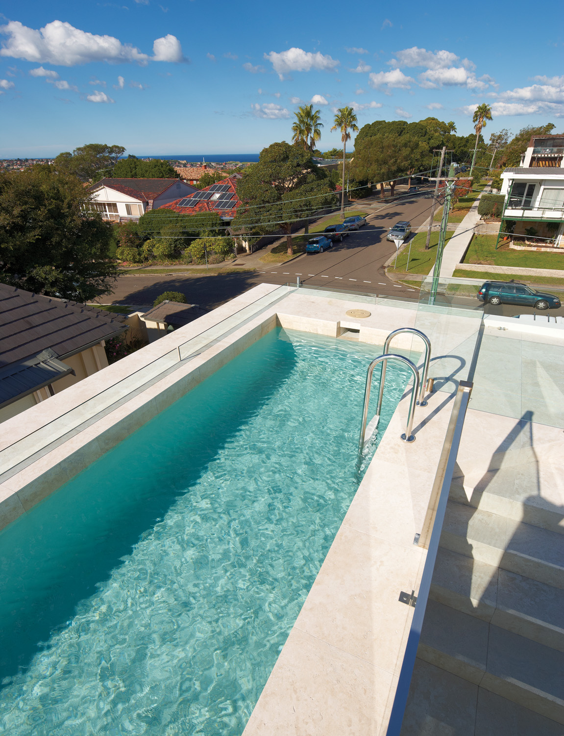 Lined with a New Zealand White Pebble interior, the pool has a light, almost iridescent, colour which subtly contrasts with the sky overhead. Travertine for the waterline and coping adds a neutral touch to the design, while glass fencing finishes off the outdoor space with uninterrupted views and a clean, modern feel.