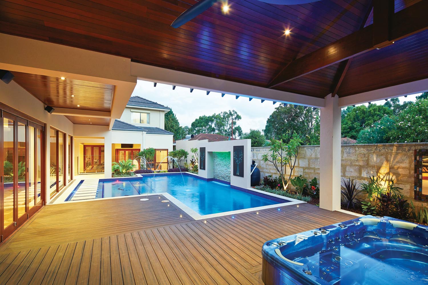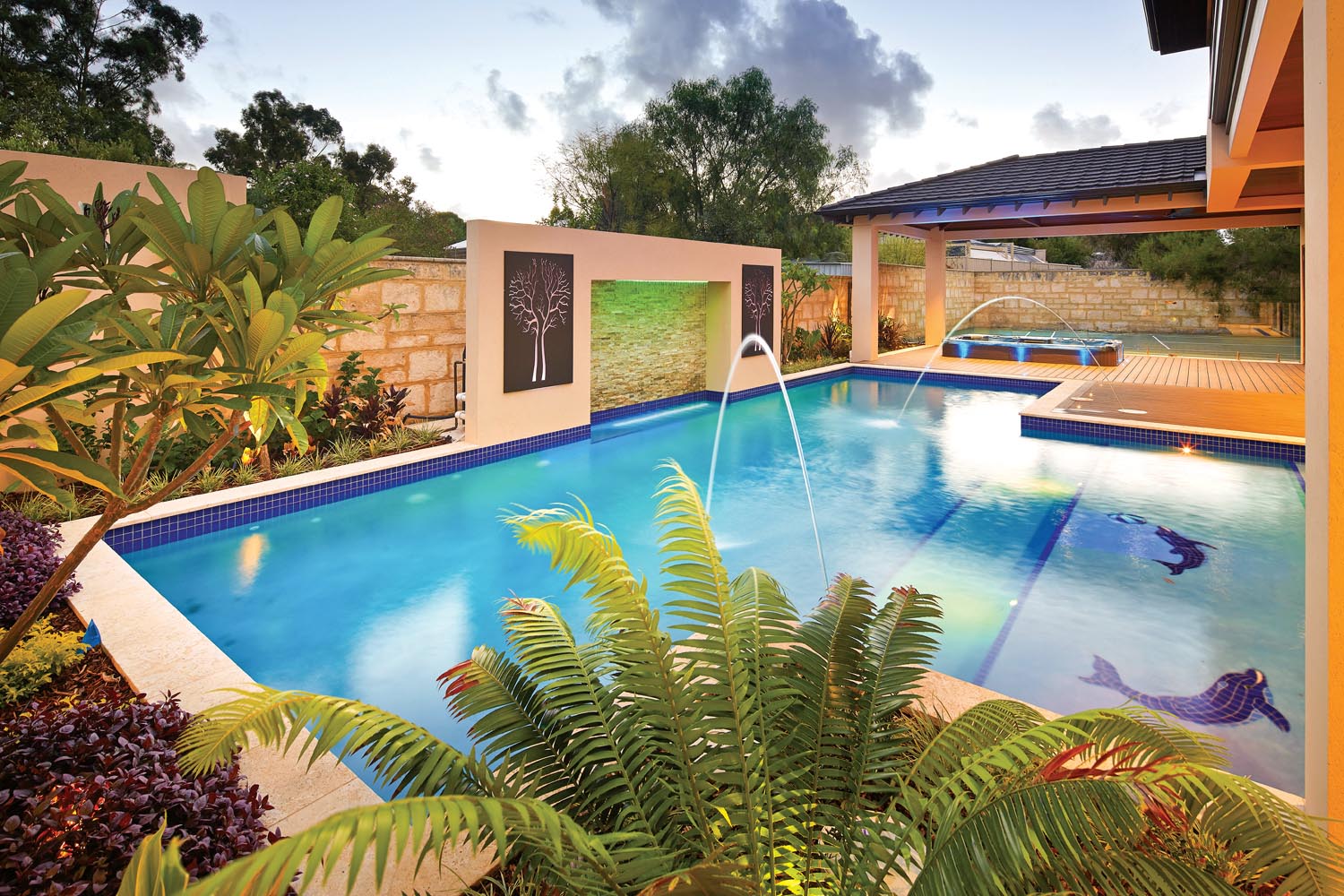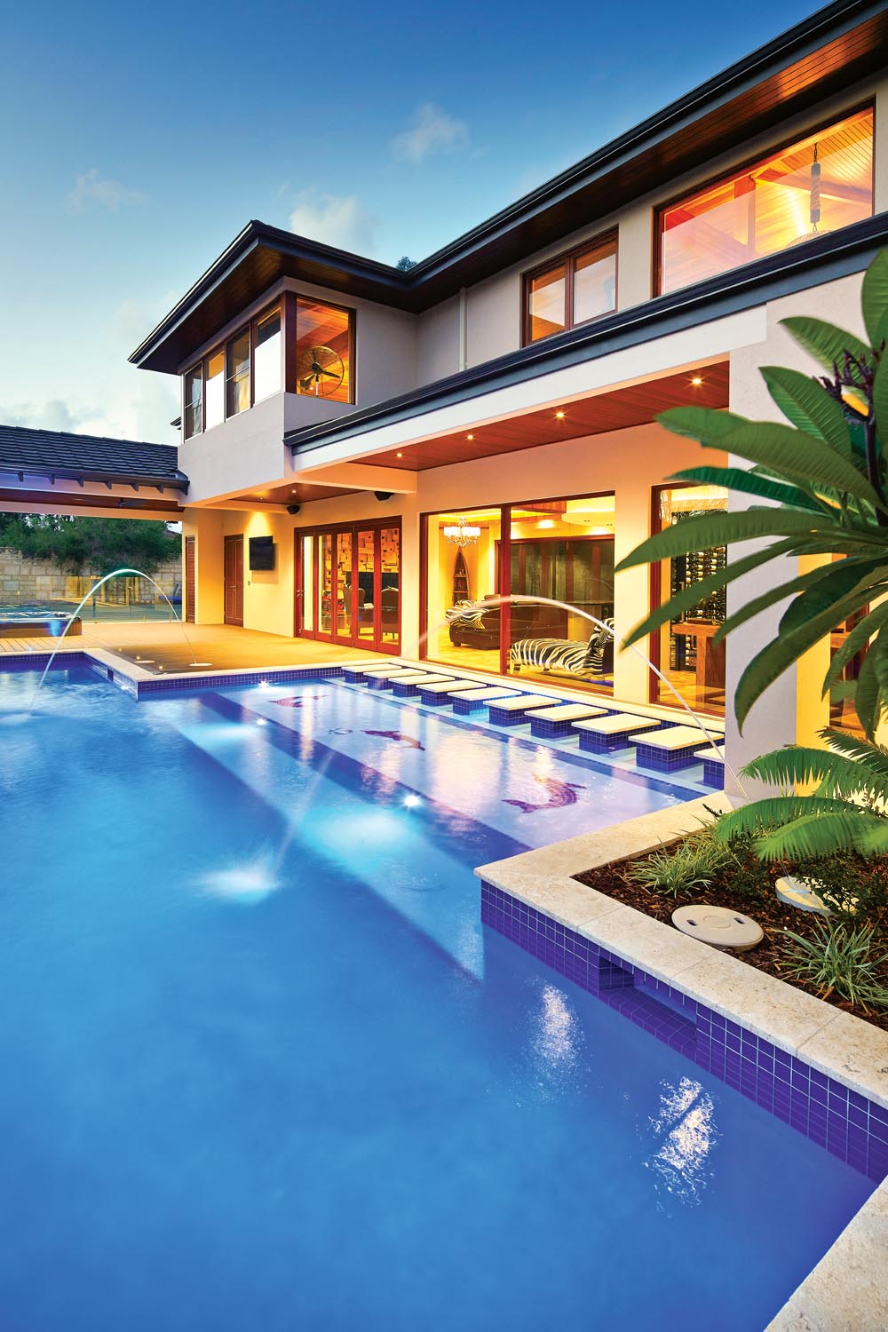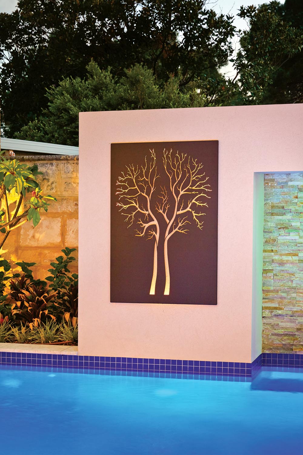 The vertical raindrop water feature comes with LED lighting and two laser-cut metal artworks placed either side, with LED back lighting. Jandy Laminar deck jets are placed either side of the steps as another water feature. The pool boasts that extra wow factor when the multi-coloured lights of the water features are turned on at night. The wall of the water feature hides the pool equipment, making it both aesthetically pleasing and practical.
