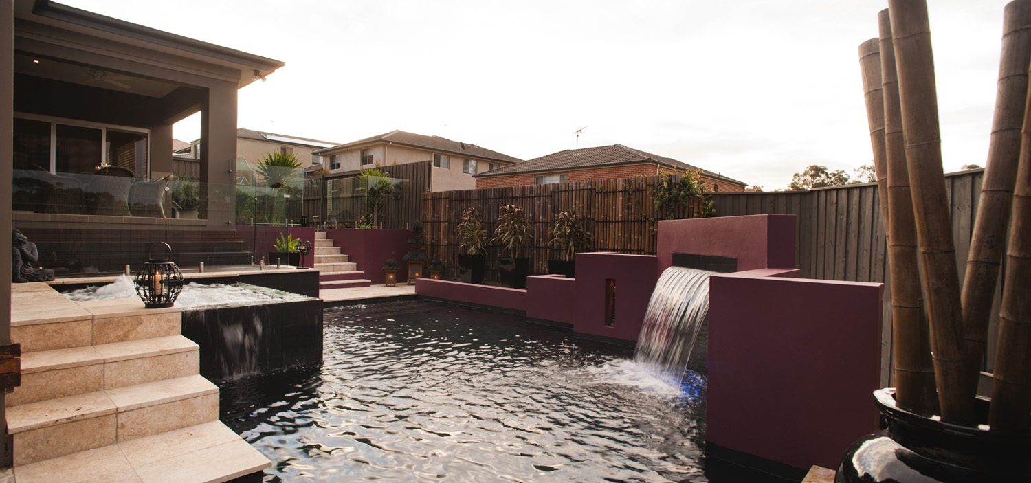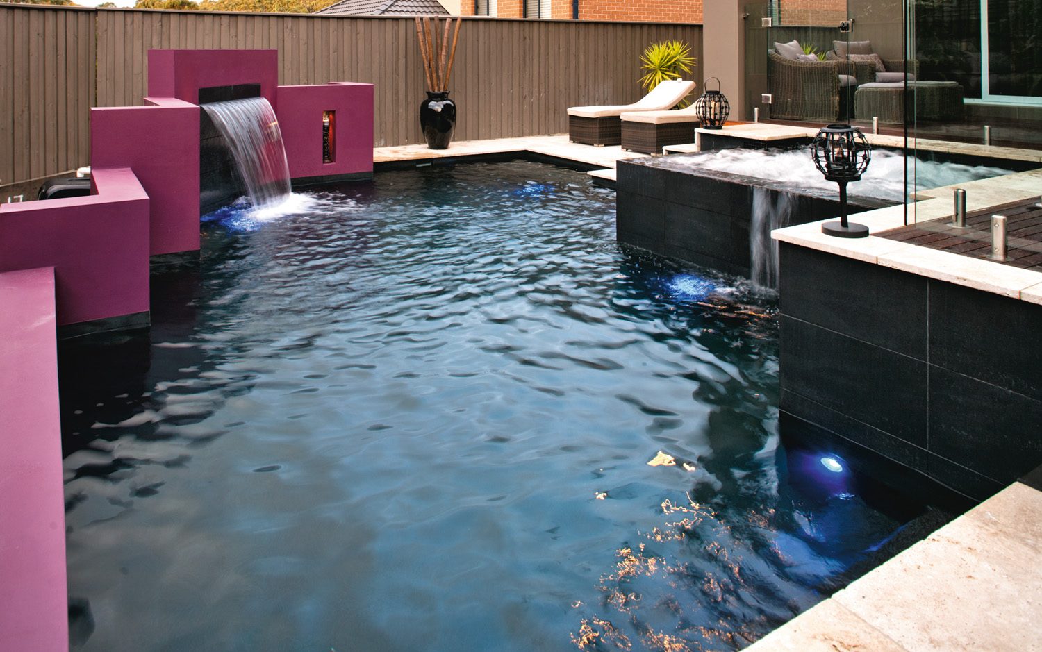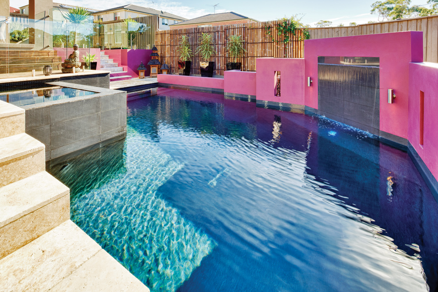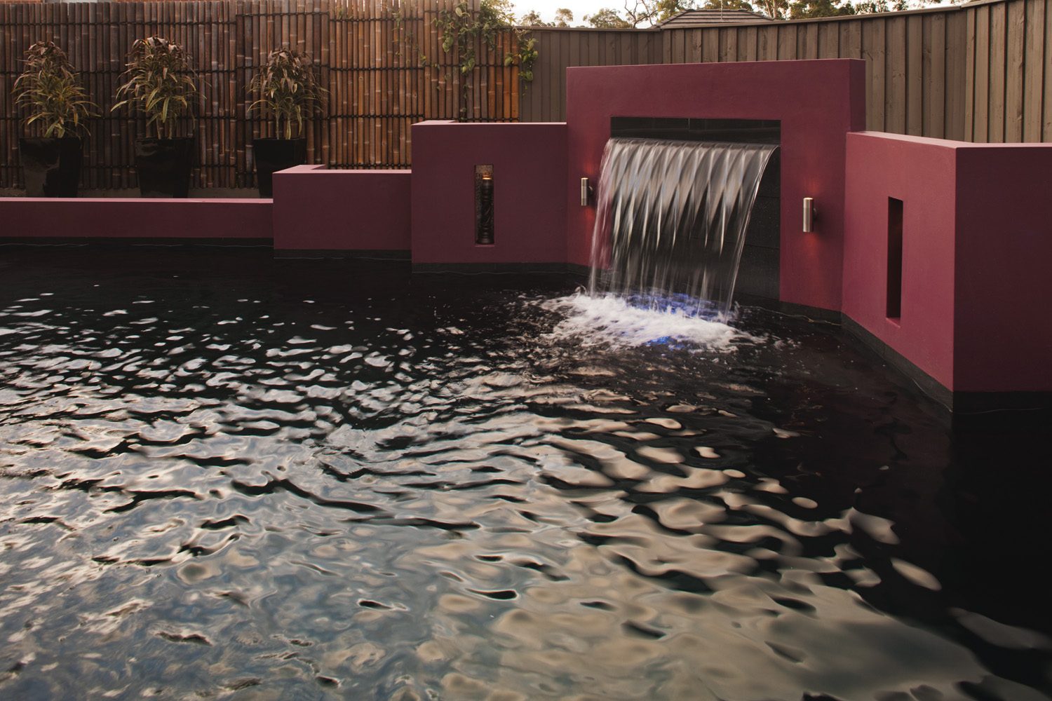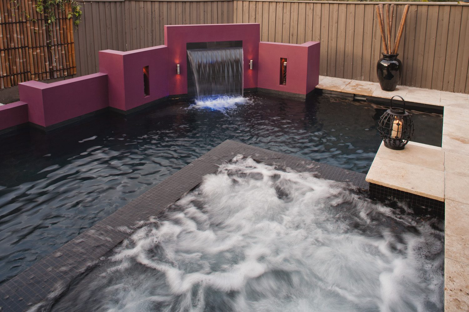 A rebated cement-rendered feature wall frames the opposite side of the pool. This feature wall, cast integrally with the pool structure, is finished in a vibrant fuchsia, which was chosen by the homeowners for a dramatic contrast and also serves to conceal the filtration equipment. Two grottos (or recesses) were cast in the feature wall, either side of the sheer-descent waterfall.
