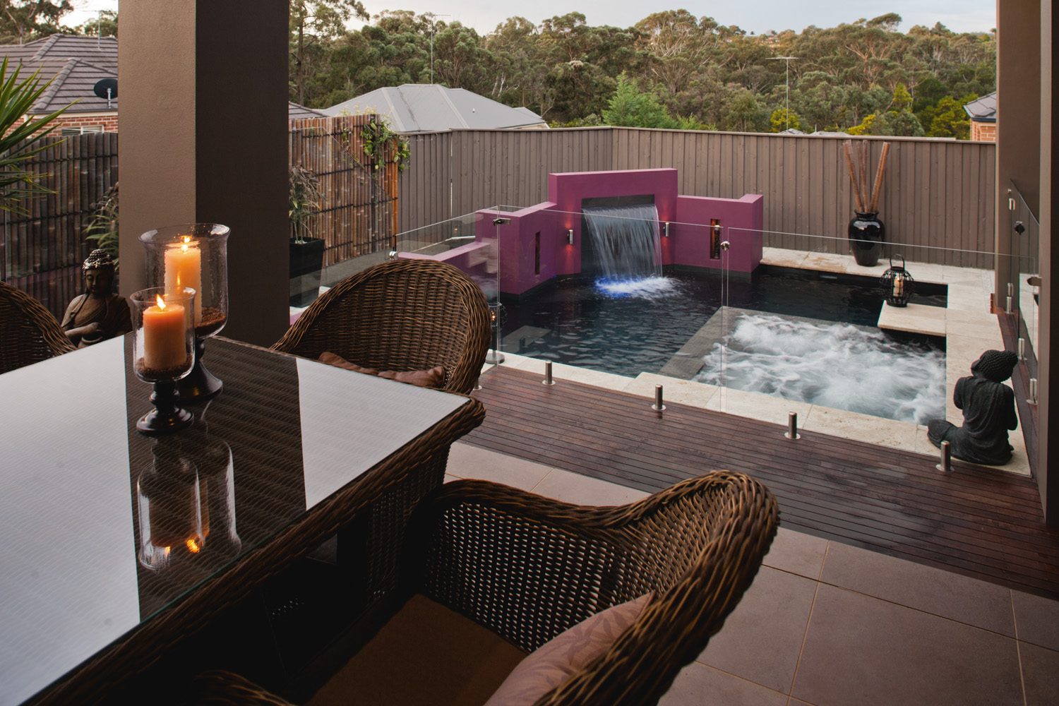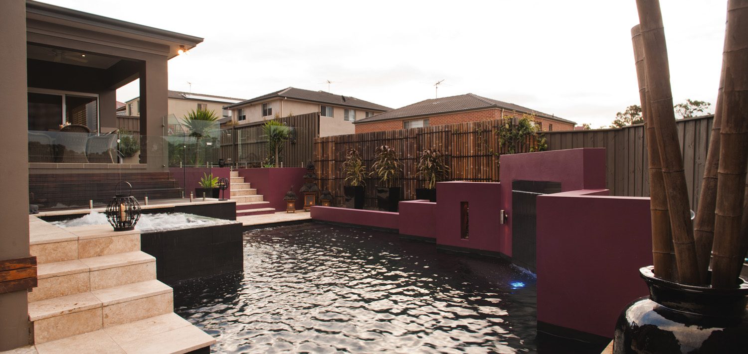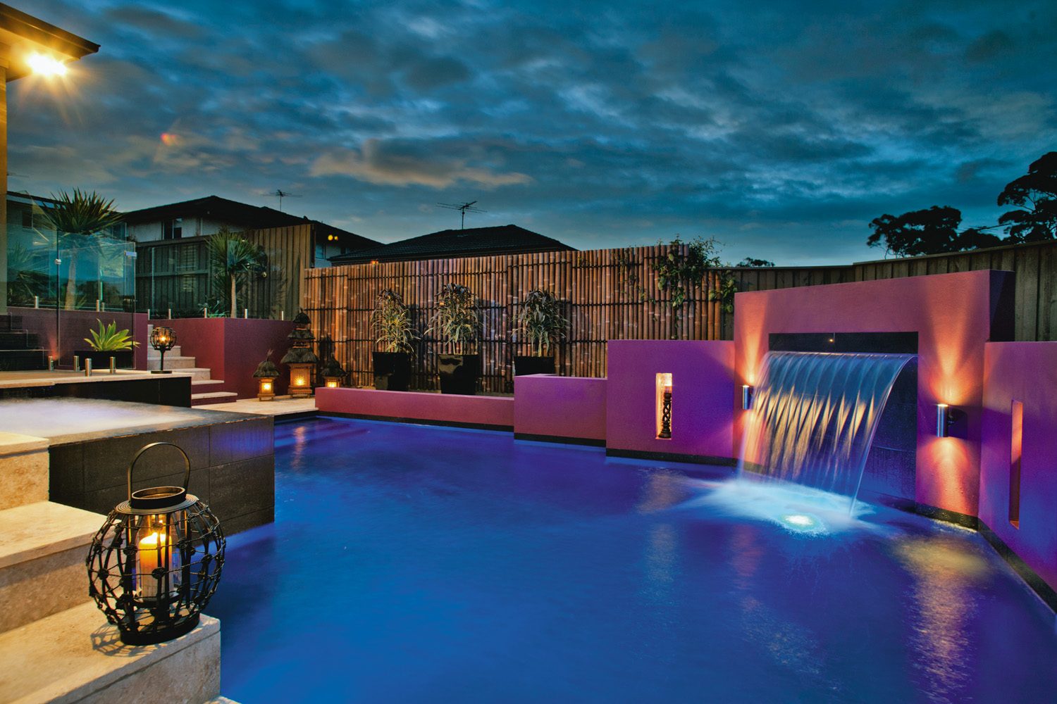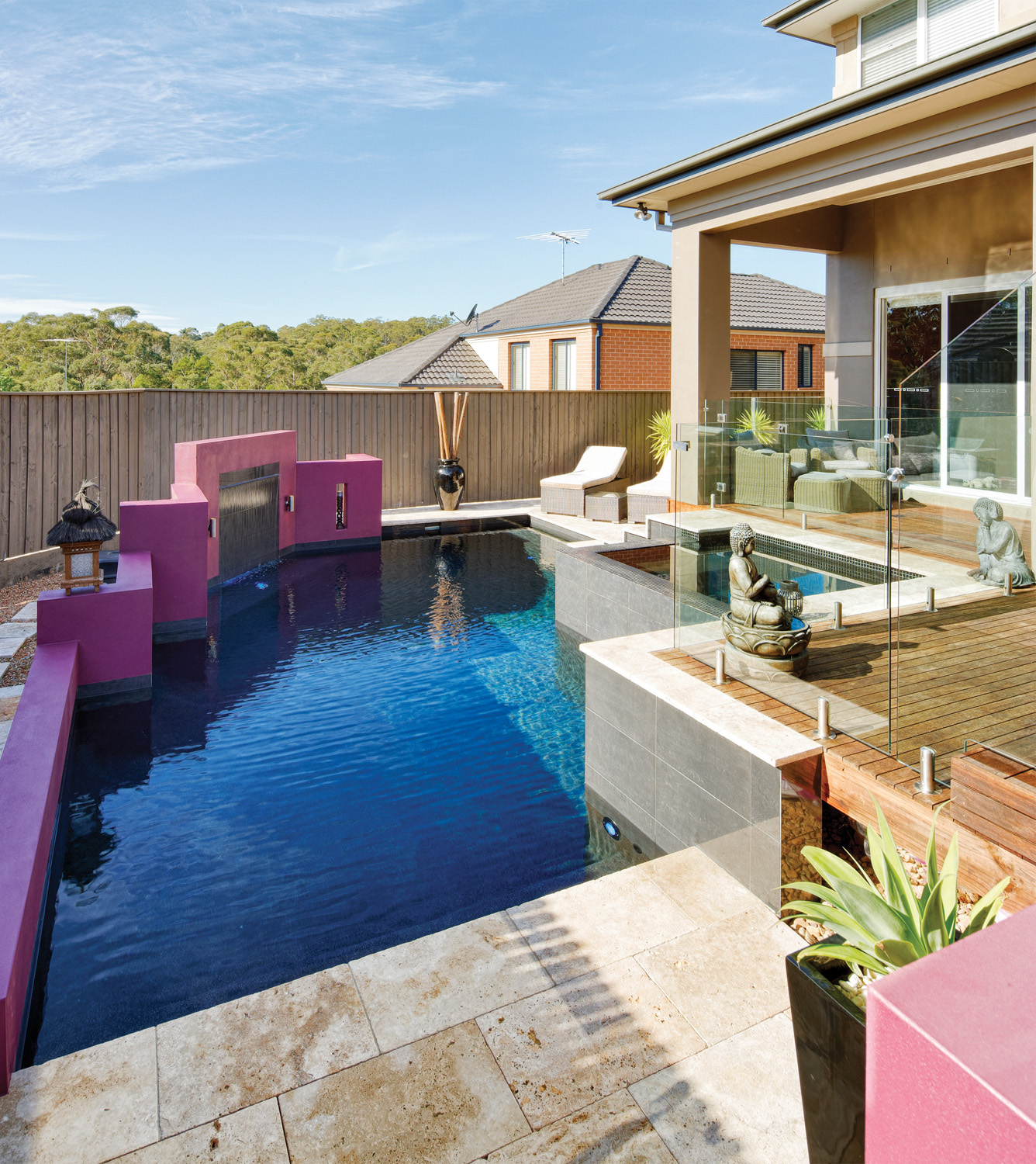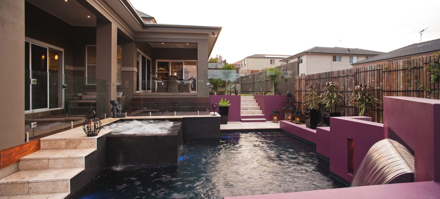 A rebated cement-rendered feature wall frames the opposite side of the pool. This feature wall, cast integrally with the pool structure, is finished in a vibrant fuchsia, which was chosen by the homeowners for a dramatic contrast and also serves to conceal the filtration equipment. Two grottos (or recesses) were cast in the feature wall, either side of the sheer-descent waterfall.