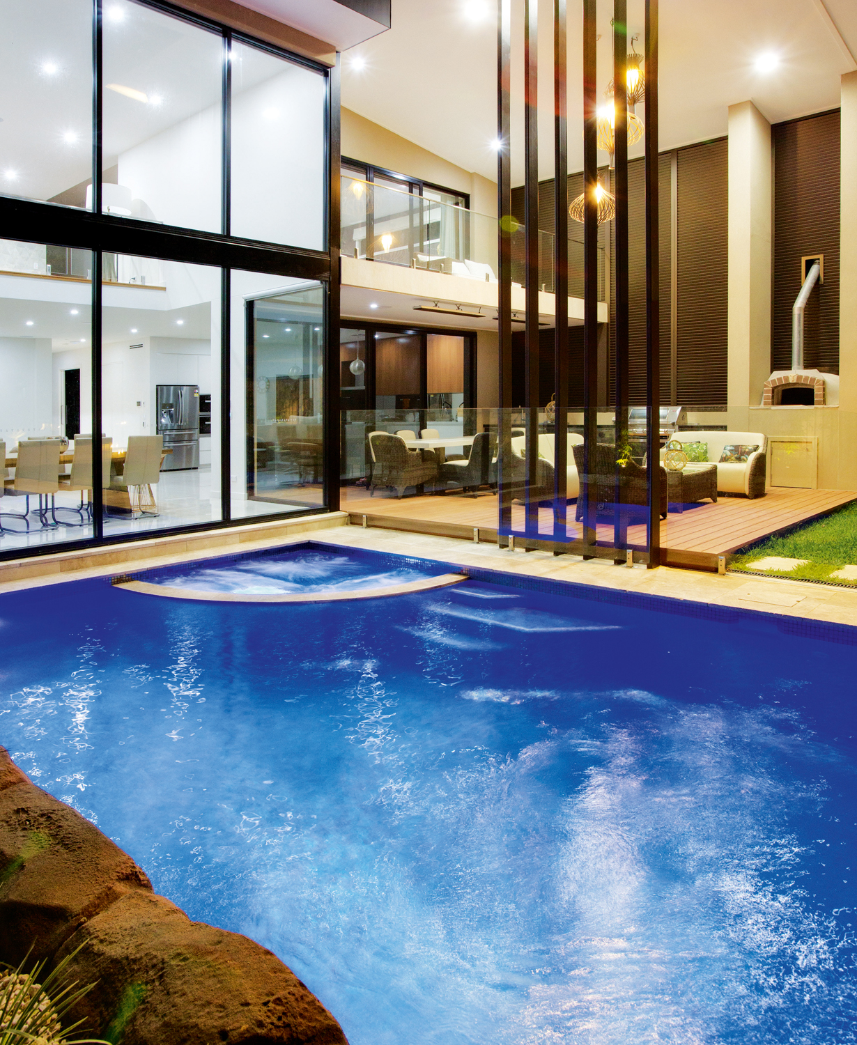 Complemented by LED lighting and pool heating, this design perfectly demonstrates that good looks and functionality can go hand in hand — with a touch of fun thrown in for good measure. BH