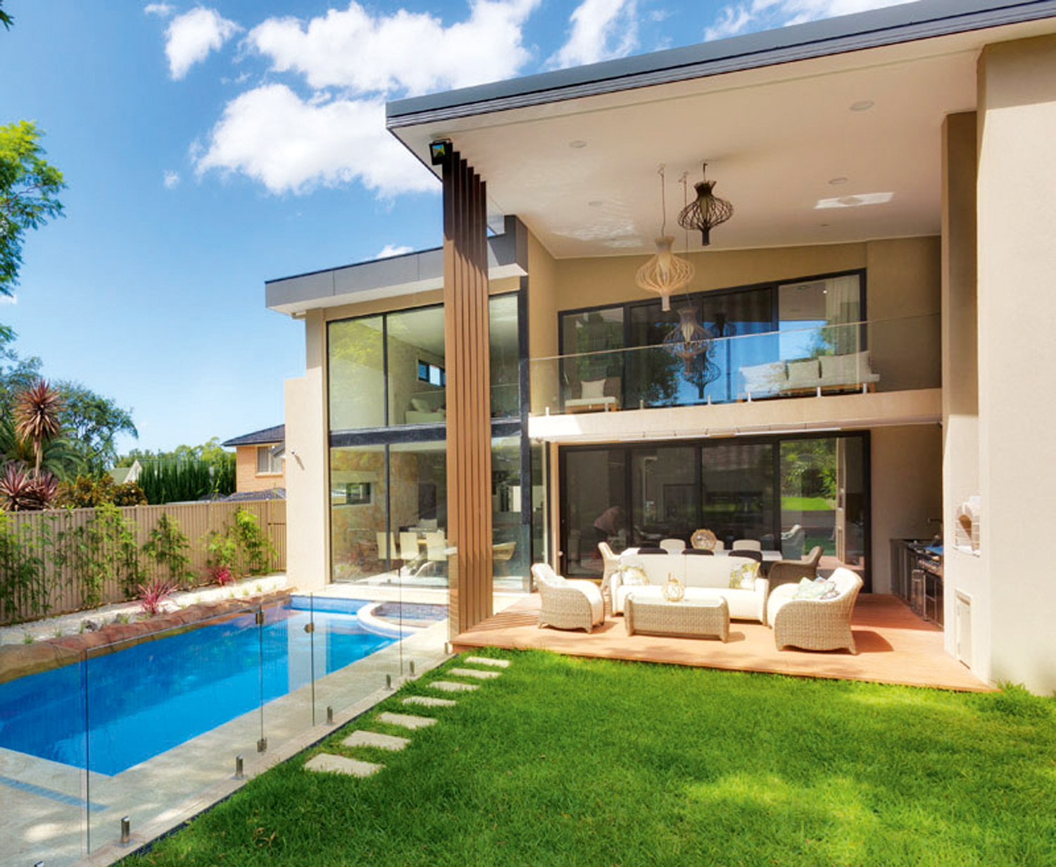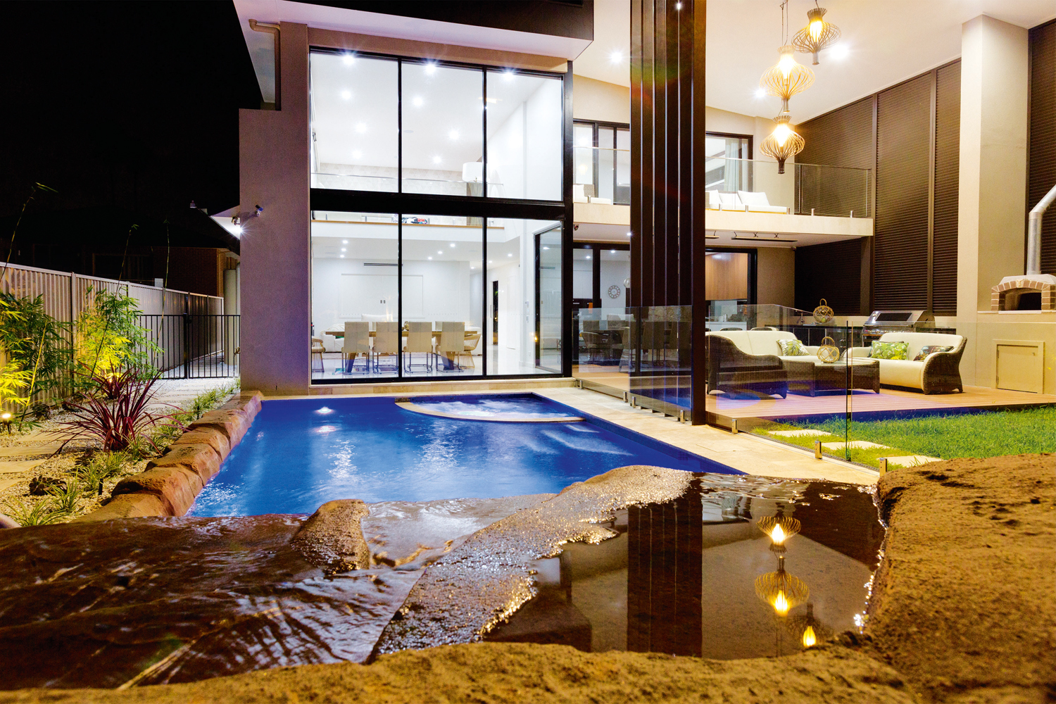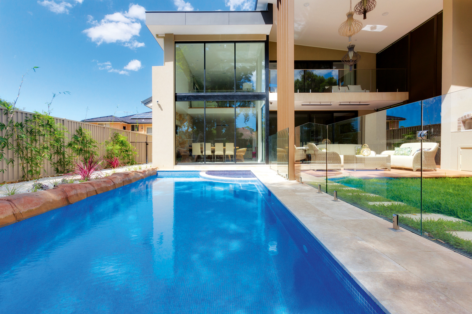 The homeowners have two young children and wanted their pool to complement their modern new home. They also needed it to incorporate