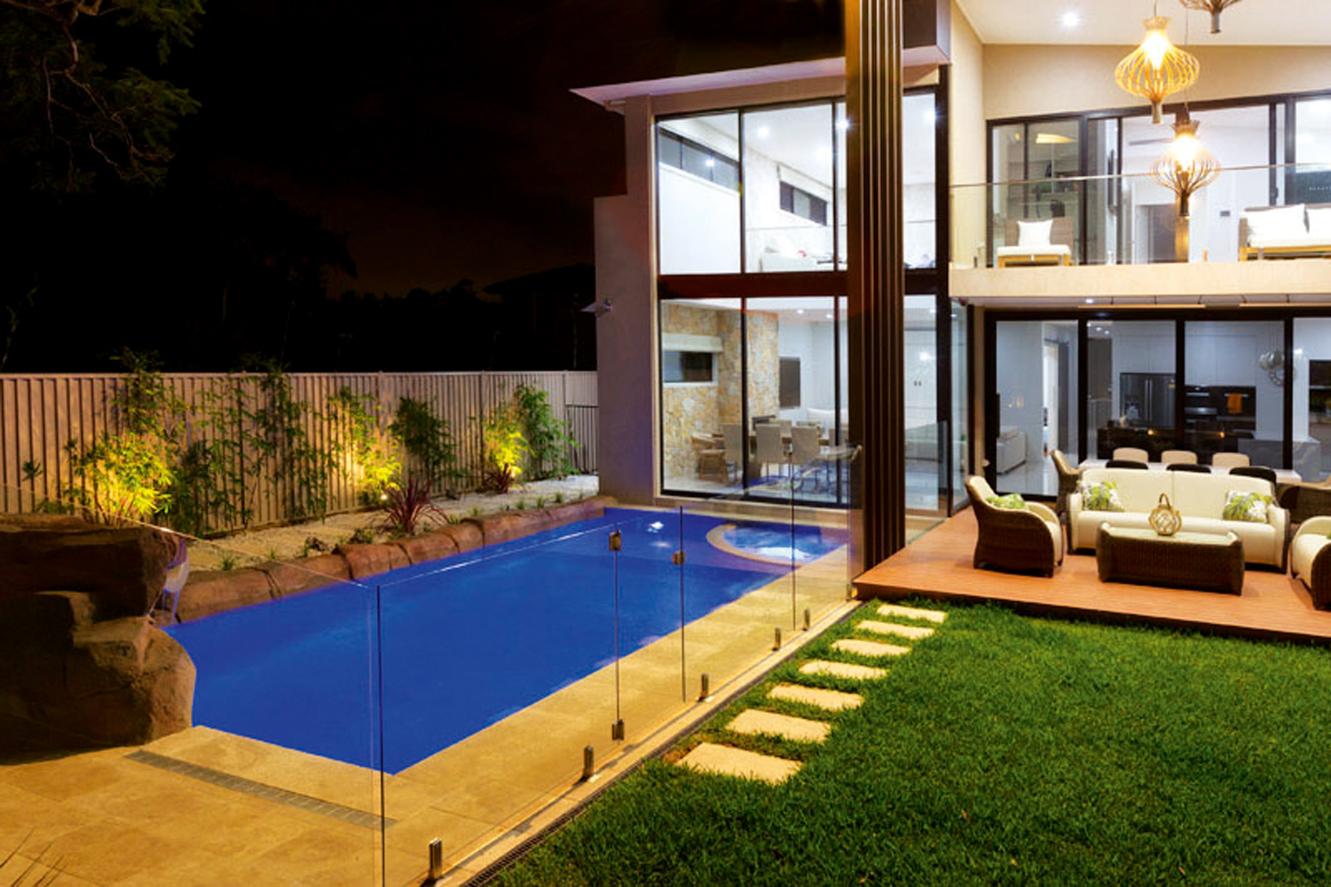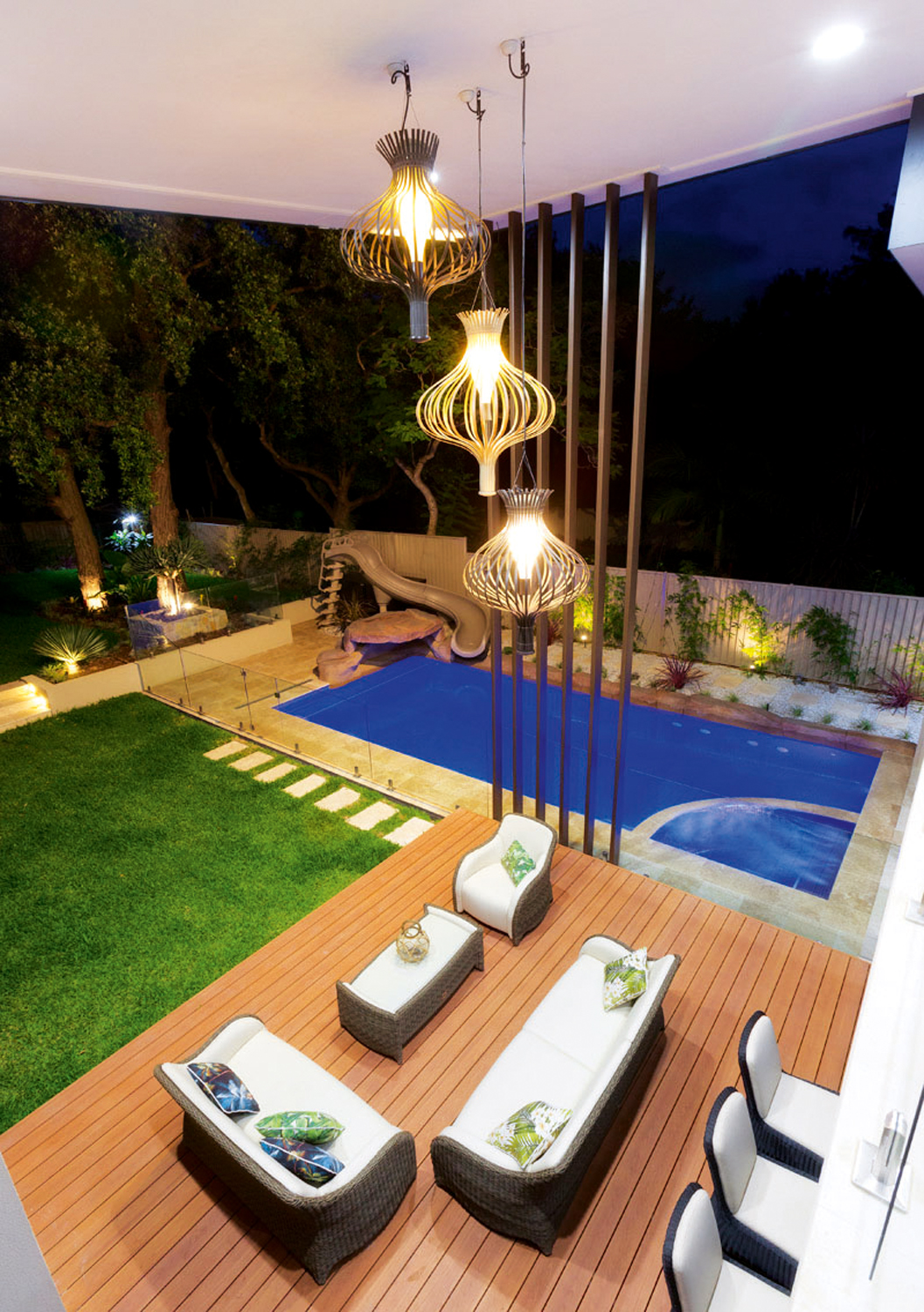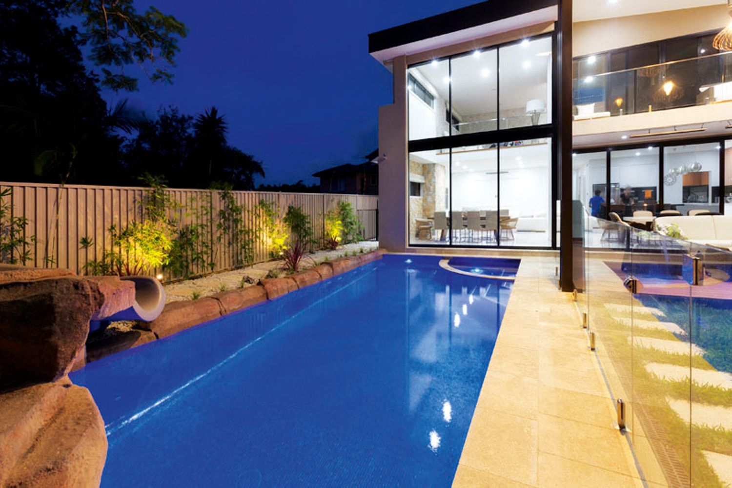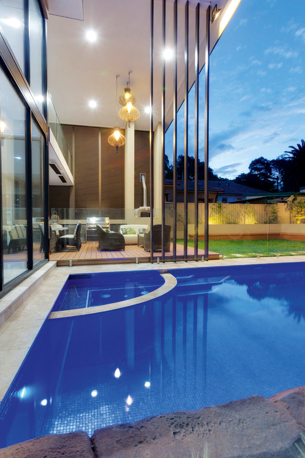 The 9m-long pool is a key design of the family’s entertaining area and is an amazing focal point when viewed from within the luxurious home. The contemporary residence is on a large, flat block so the pool could have been positioned anywhere, however, it was built close to the house so it becomes a feature of the entertaining area. This allows parents to watch the children swim from inside or outside, as frameless glass fencing ensures an unimpeded view.