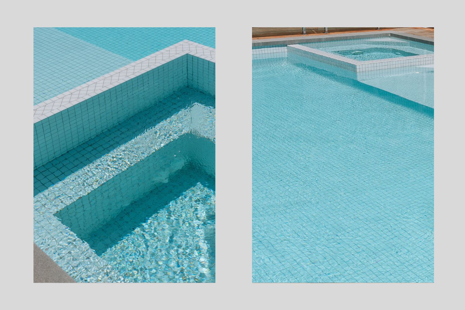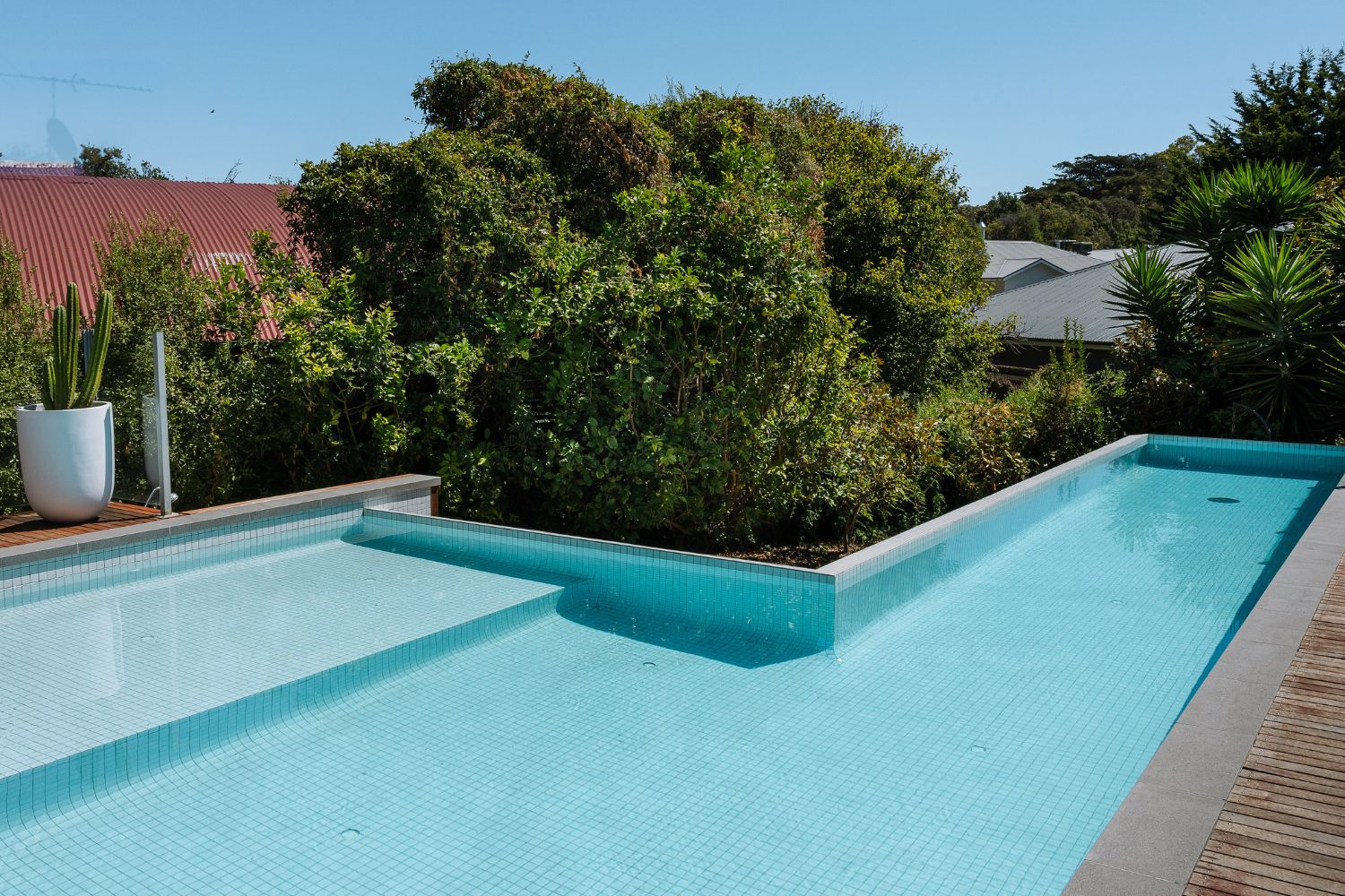 The renovation involved a complete overhaul of the existing pool, which had suffered from structural issues and worn-out finishes. The pool was originally equipped with dark blue tiles that were falling off, a Quartzon interior that had come loose, and coping that was in poor condition. Breeze Pool Projects stripped the pool back and fully tiled it with beautiful 48mm Origami Frost Mint tiles from The Pool Tile Company, giving it a modern and vibrant bluegrey hue. The new Jupiter drop face coping also added a sleek finish to the pool, now squared off for a more contemporary look. The design focuses on both function and style, providing a spacious, entertainer-friendly layout, with a spa and shallow swim-out area perfect for all ages.