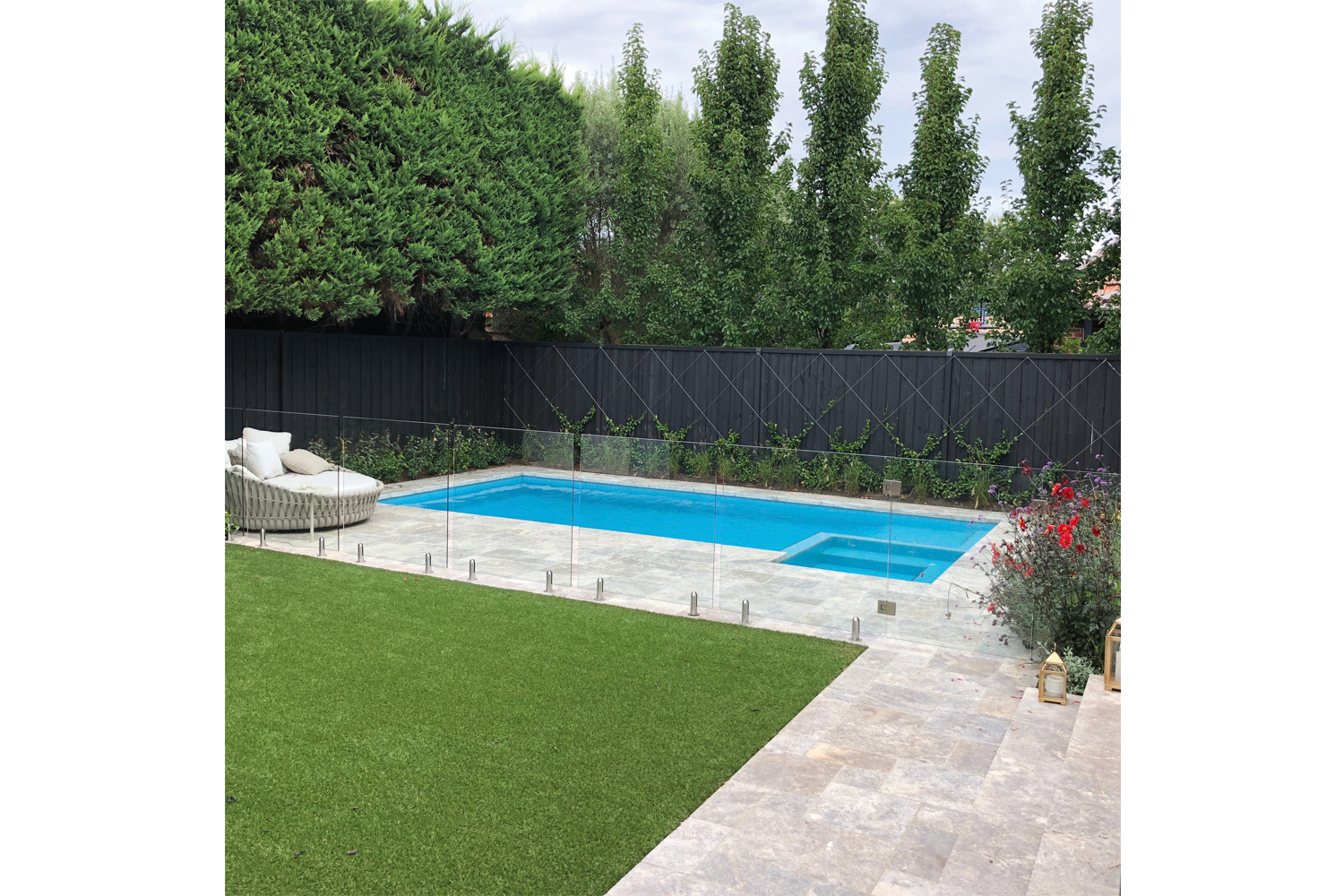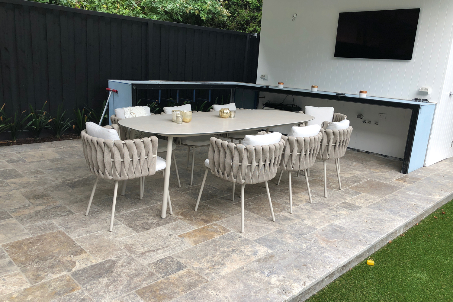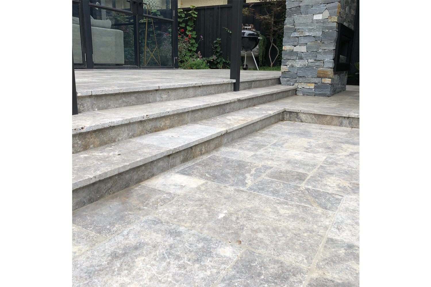 The rear of the property required a completely different treatment. The client chose silver travertine tiles and pool coping boasting beautiful colour tones that complement the pool tile colour and outdoor furniture.