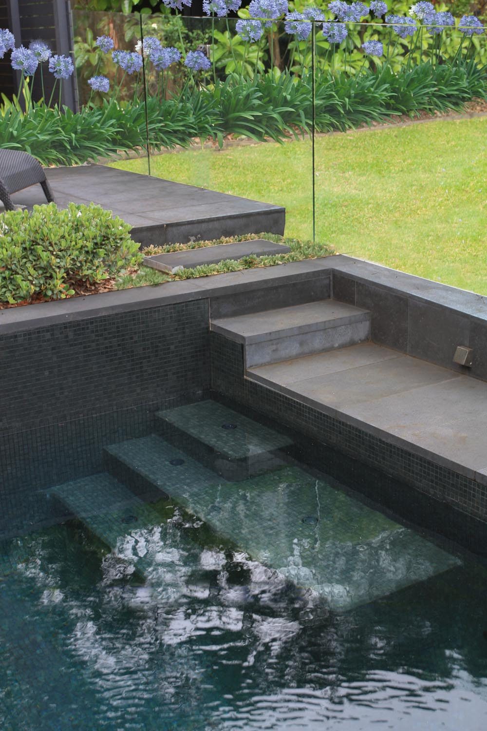 The water colour created by the mottled black glass tile mirrors the native gum located to the rear of the pool during the day and beautifully reflects the garden and house lights at night. This, together with the contemporary square-edge downturn of the paving, makes a bold design statement that showcases the stylish and contemporary home.