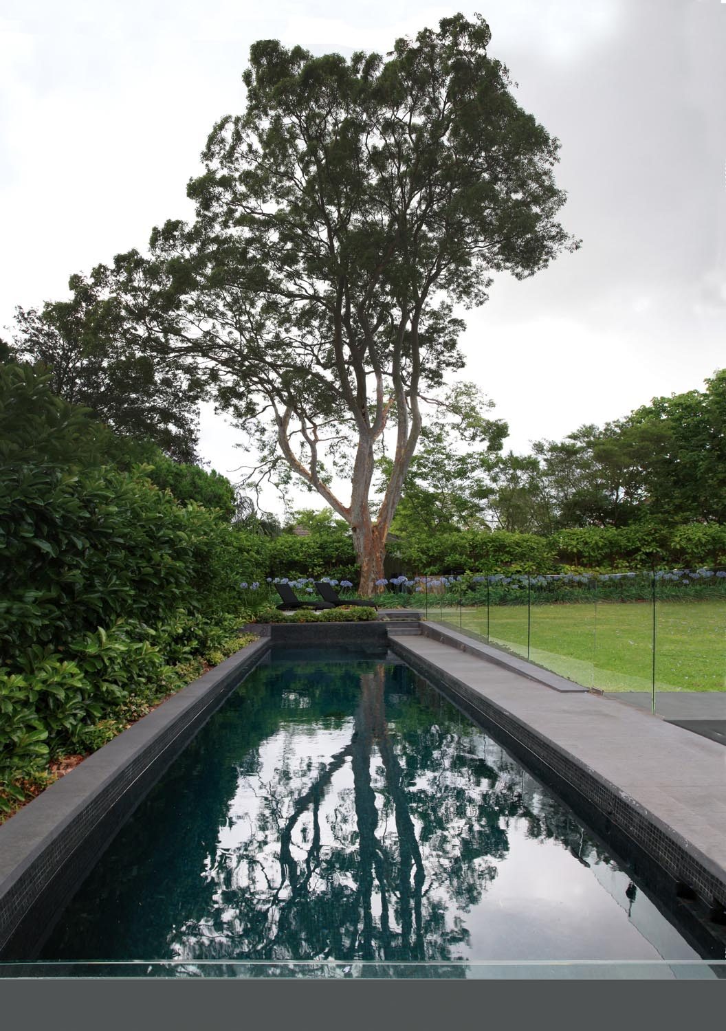 The simple rectangular pool shape and elevated poolside sitting area coupled with the dark paving and pool colour come together to create a unique contrast with the bright green surrounding gardens that act as an attractive frame to the space.