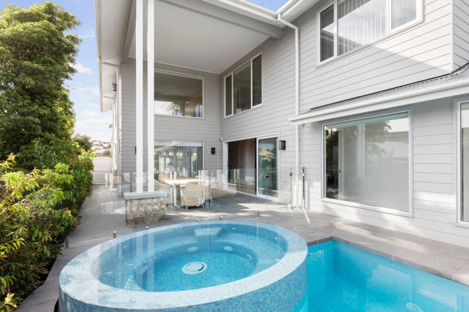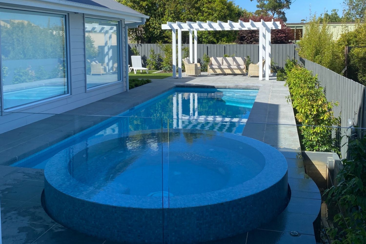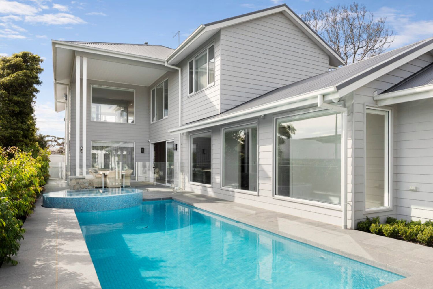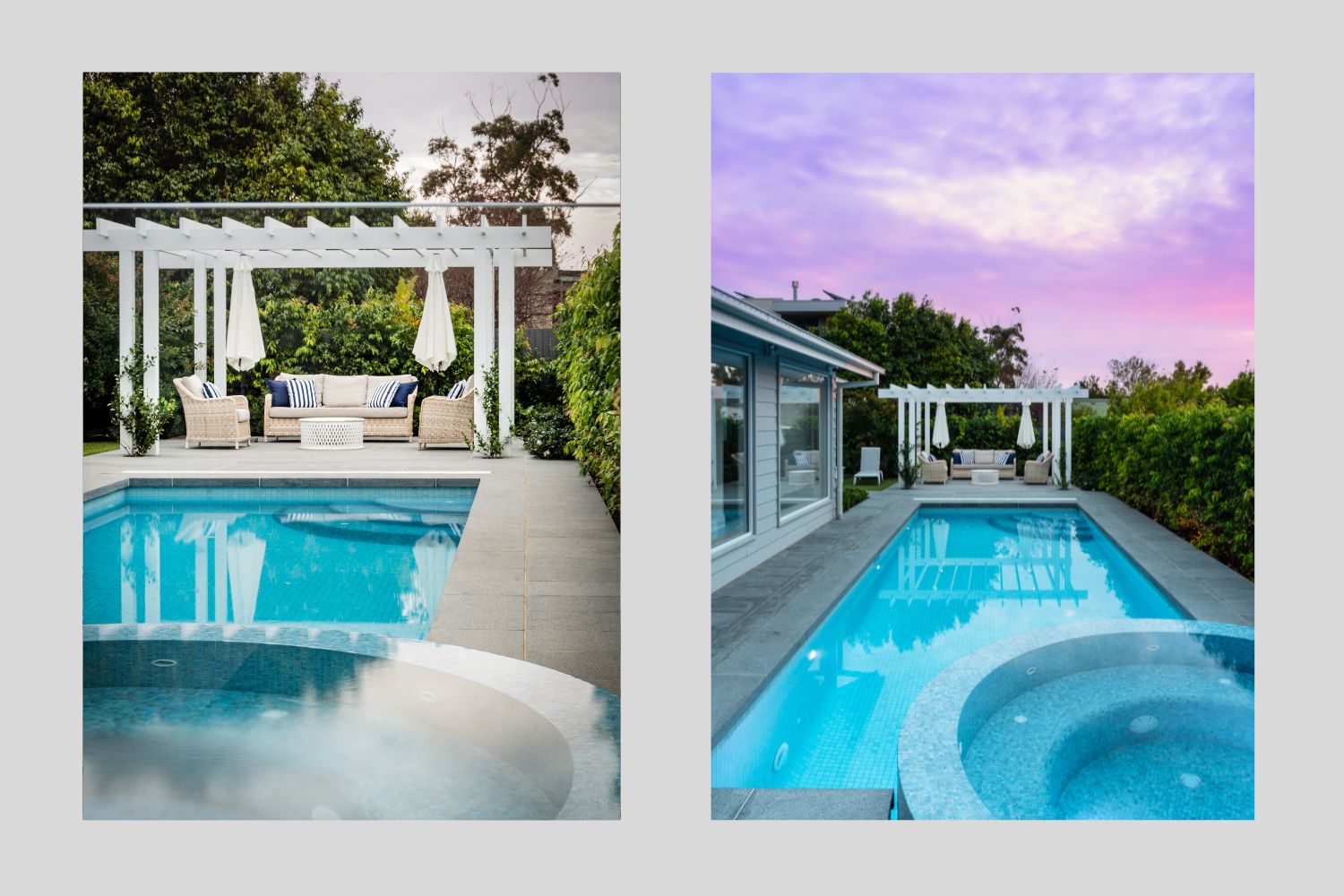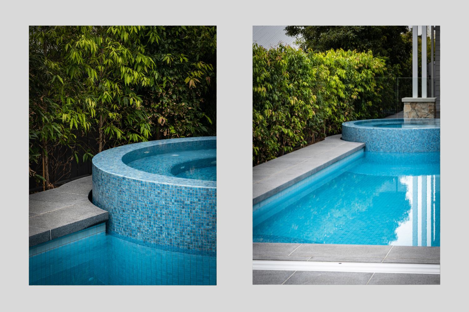 Given the coastal setting and the clients’ eye for timeless style, the design vision was to seamlessly integrate a pool and spa into a compact block, while keeping the outdoor space open, low-maintenance and inviting. The centrepiece is a beautifully tiled concrete pool by Feature Pools, complete with an integrated round spa that doubles as a stylish focal point.