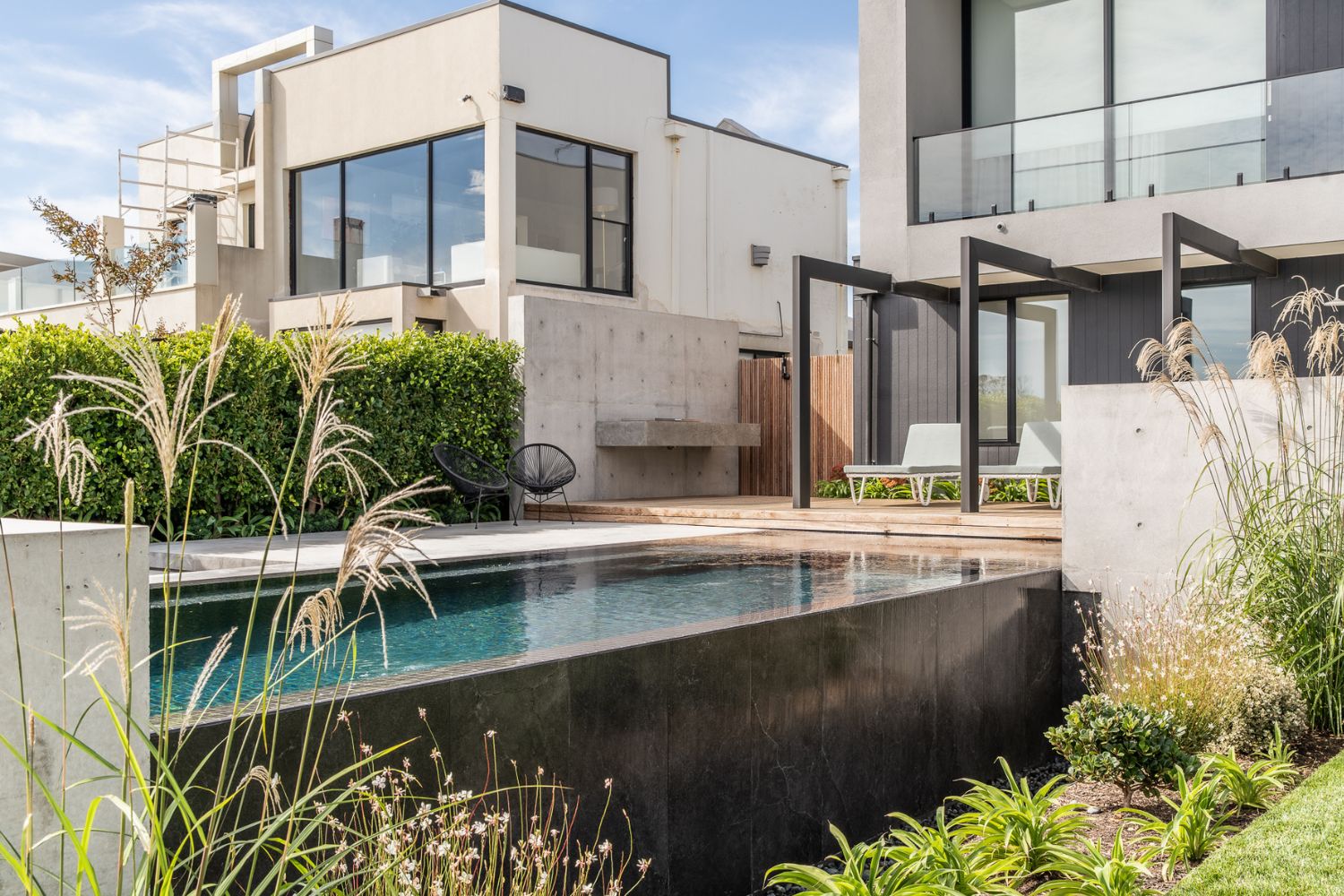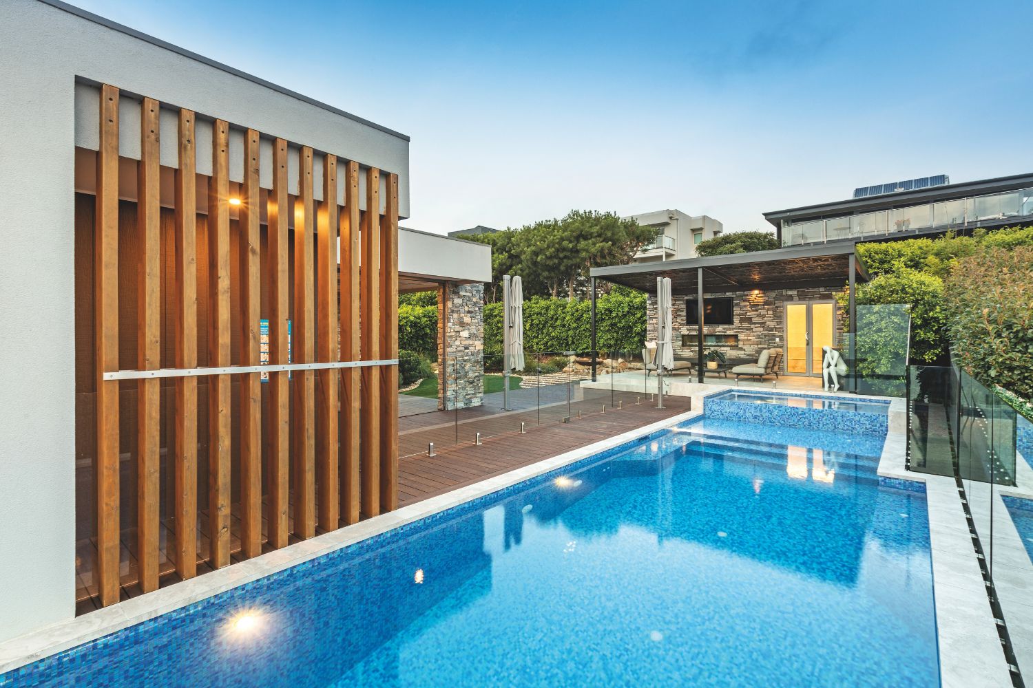 A magnesium or mineral pool is a great choice here — gentler on the skin and easier on the environment. Clean lines, natural stone, soft landscaping and tranquil water features like a sheer descent or blade waterfall turn your pool area into a private day spa.