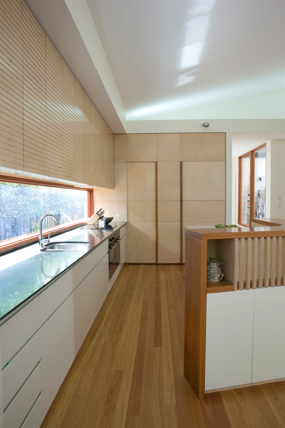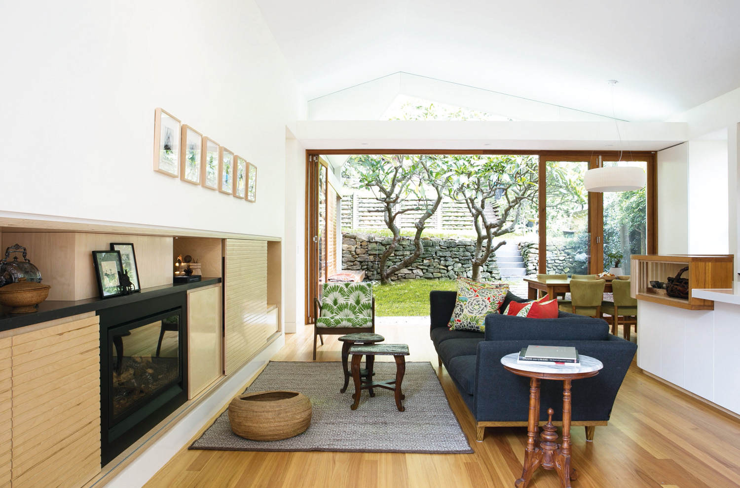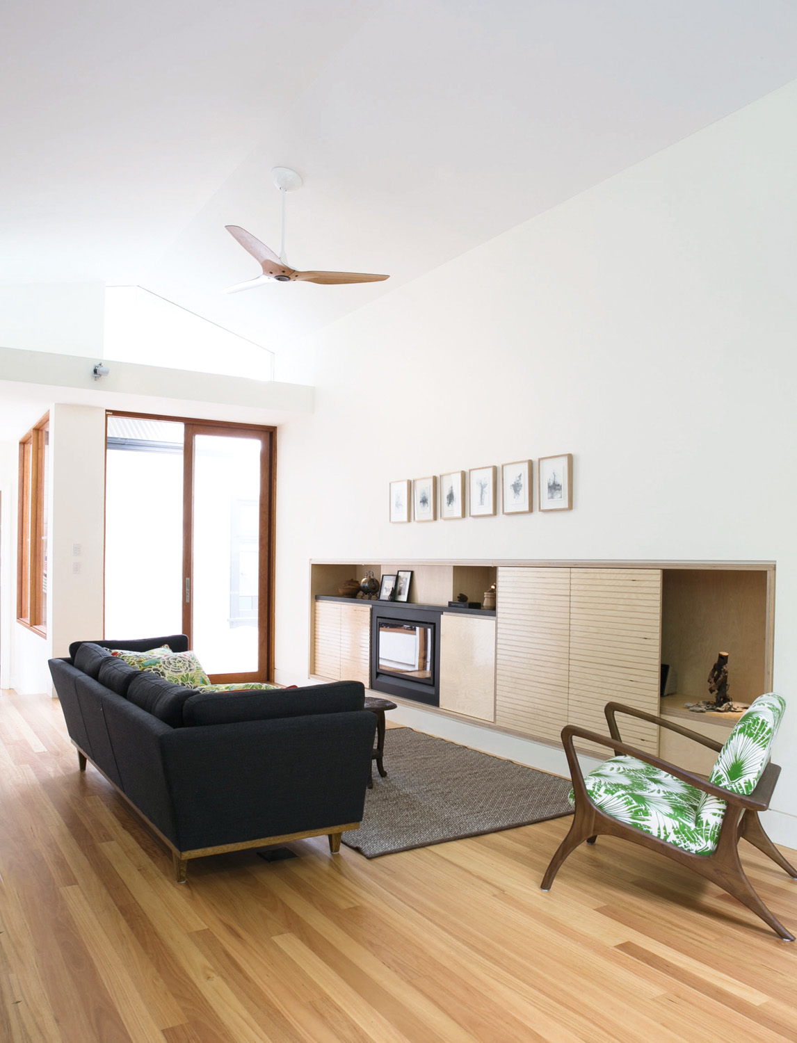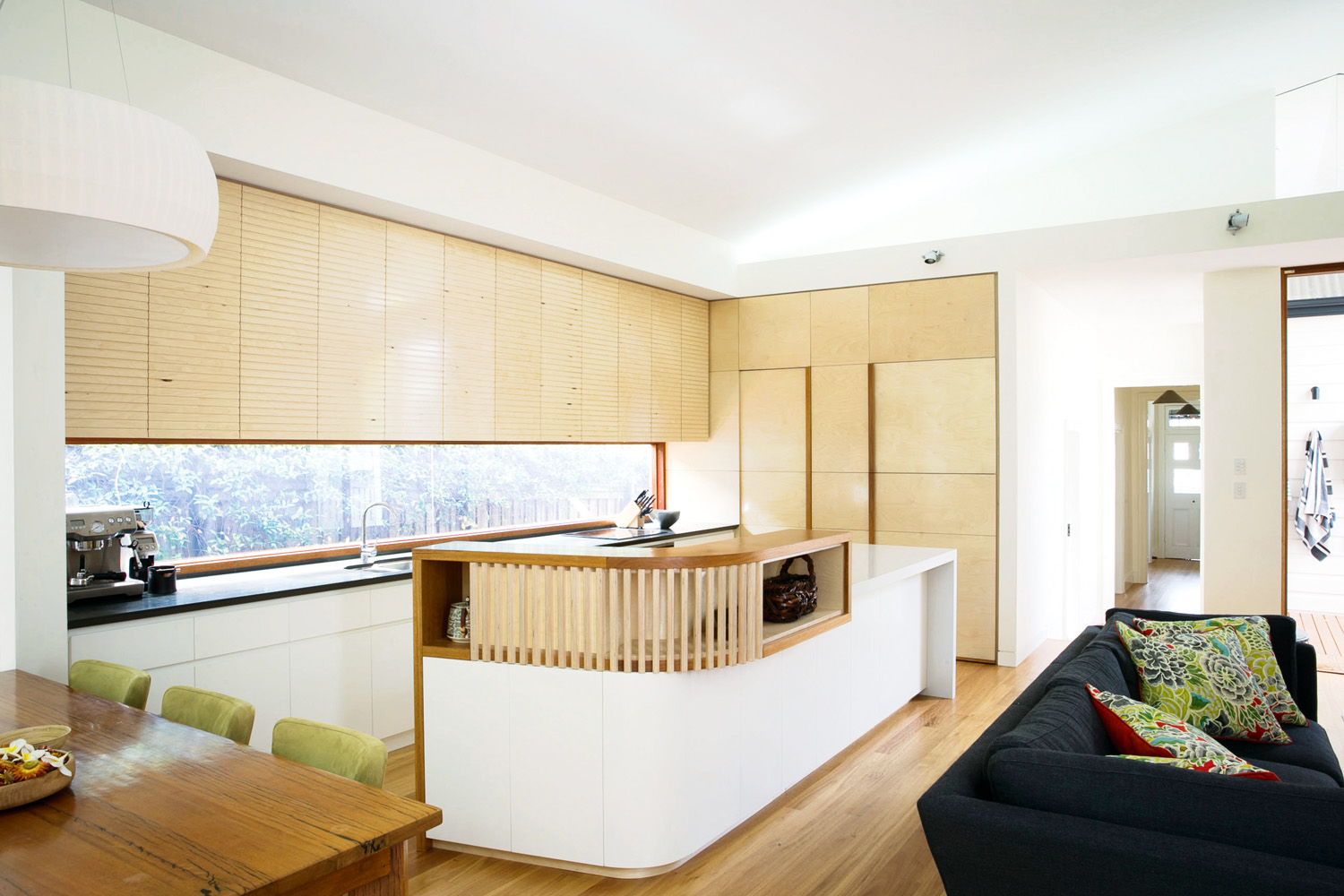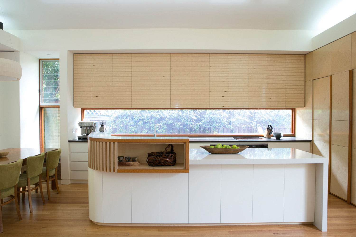 Investing in quality joinery was a smart decision, with the results speaking for themselves. Birch plywood with a signature grain is present throughout the living and kitchen spaces, which serves as a contrast against the curved blackbutt timber wrapped around the kitchen island. Storage is integrated in a clever way, with the blackbutt housing a nook that doubles as a design feature. Flowing onto the living and dining area, the space is very much open, providing plenty of room for the family to coexist comfortably. “We enjoy the relaxed, open-plan living because we can all be together while we prepare meals and come and go,” says Ian. “Now we have enough space so everyone can sit down at the same time. It’s also great that we can eat from our vegetable boxes, which are brimming with lettuce, rocket, rhubarb, artichokes and herbs.”