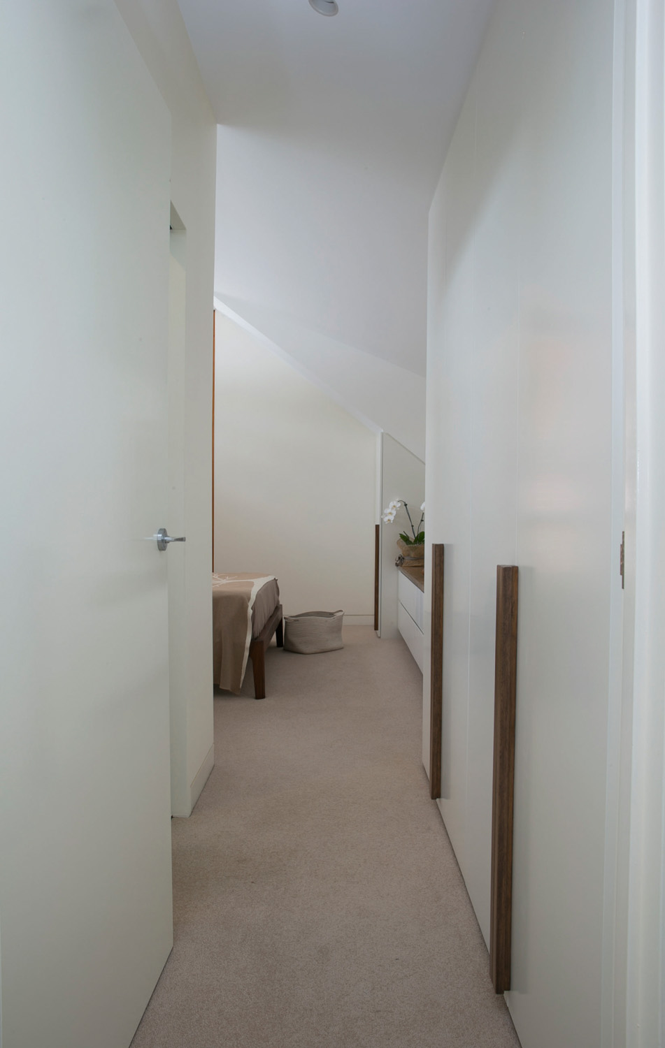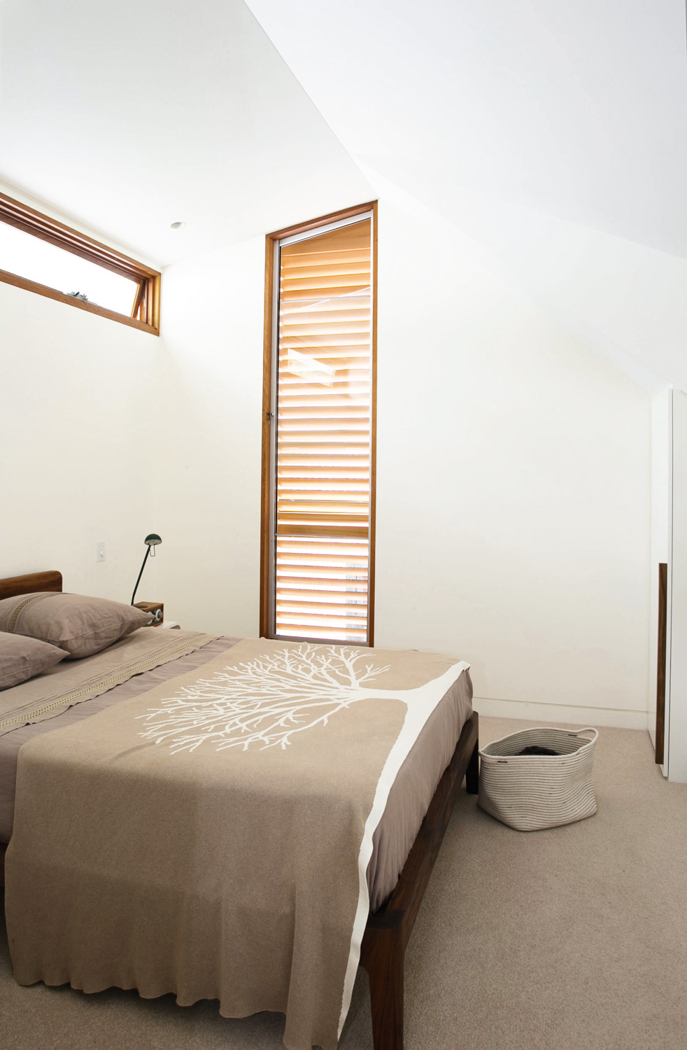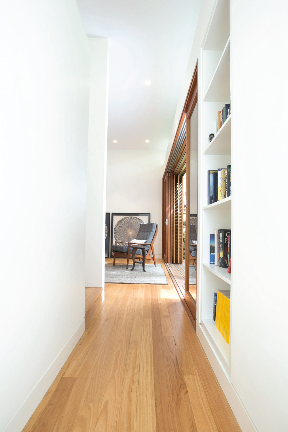 Leaving the four bedrooms at the front of the house, the back of the property was the main construction site, with a new living, dining, kitchen, main bathroom, master bedroom with ensuite, family room and laundry created. Significant landscaping works were also undertaken, with a new driveway and barbecue area installed as well as the placement of vegetable boxes in the front garden, which were a must-have for Ian and Sally. Constructed from cedar wood, the ancient Japanese technique Shou Sugi Ban was utilised, which preserves wood through the process of charring. “We wanted to keep the cottage feel of the house, but also incorporate some Japanese design ideals like the genkan porch area with lockers for shoes, hooks for beach towels and a Zen rock garden,” says Ian. Serving as the favourite space of the home, the genkan porch — a traditional Japanese entryway — is drenched in light as the sun rises, making it the ideal place to catch some early morning rays.