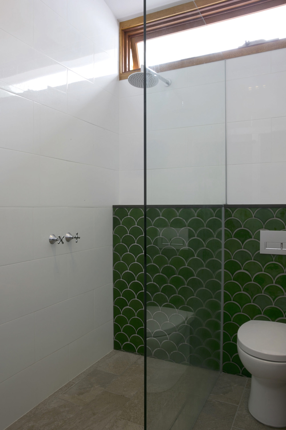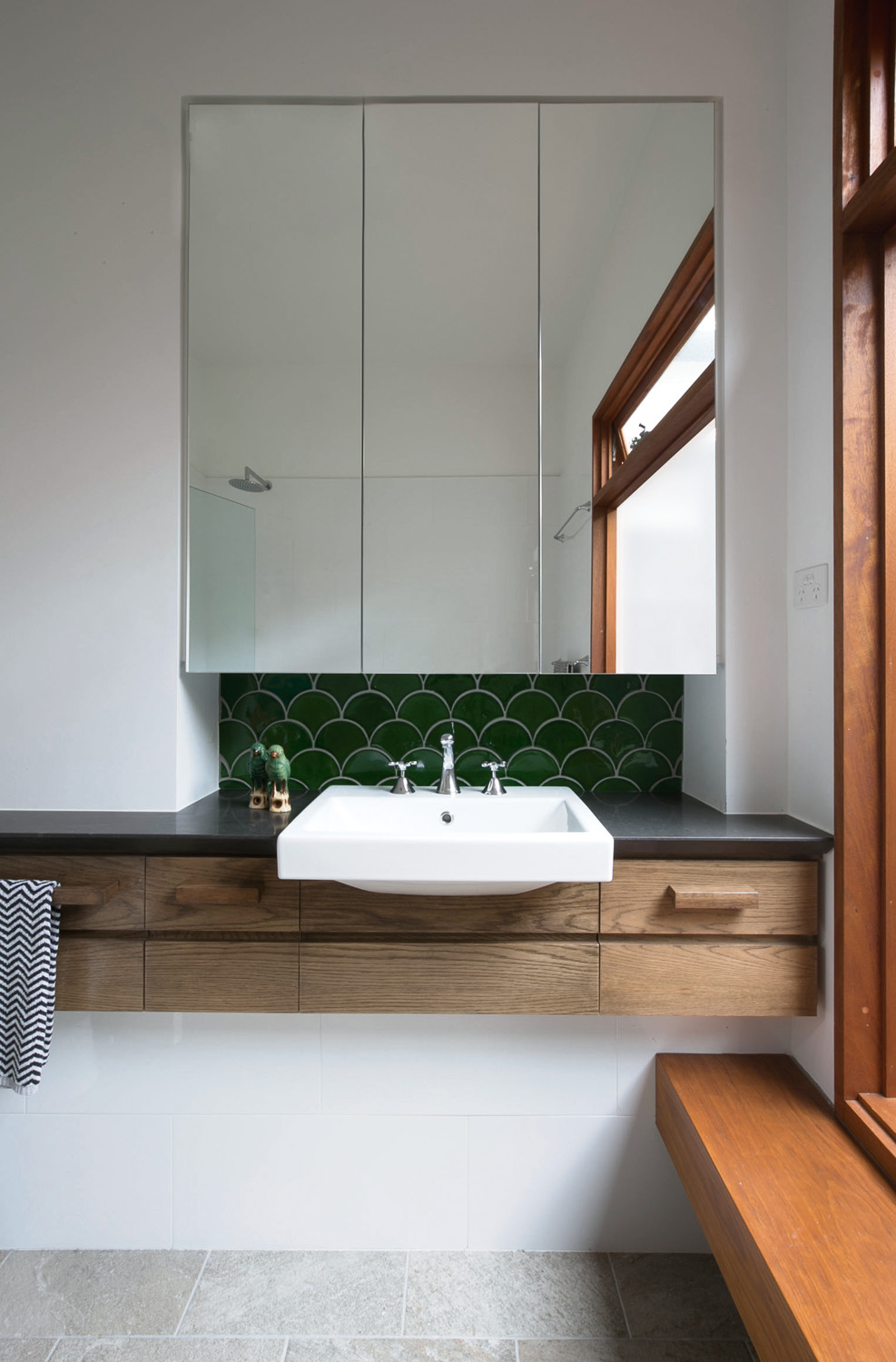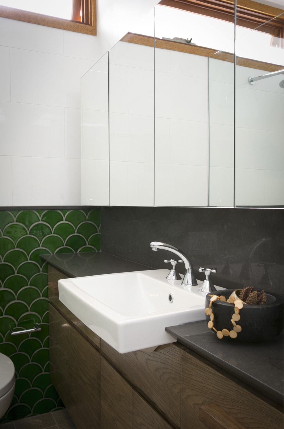 Project Colour Palette: Red and charcoal grey give a Japanese feel to the bleached timber accents of this home. Federation green in the tiles of the bathroom are a nod to the history of the residence. Pistachio seating in the kitchen gives a contemporary feel