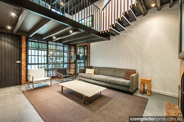 When it came to choosing those materials, they wanted to stay true to the original form of the building that Robbie loves so much. Peeling back the layers, there was a lot of red brick, steel and concrete so they continued to use those elements and added timber to give the home warmth. The home gets its industrial feel from the exposed brick, raw timber, polished concrete and black-painted steel.