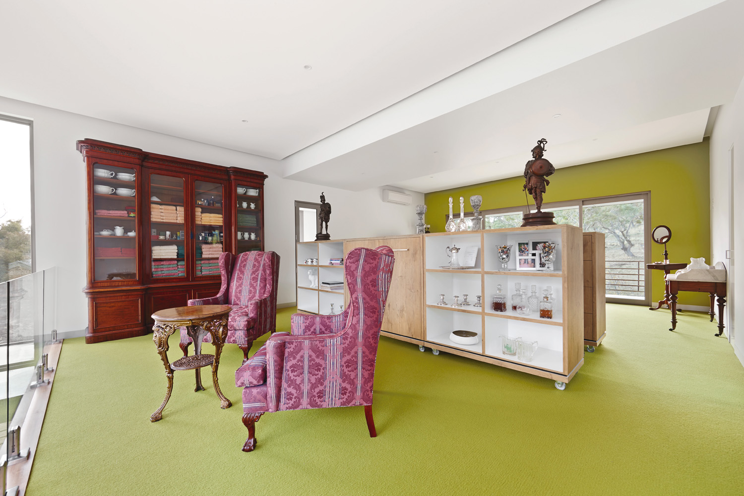 The interior of the home is not what one would expect given its industrial exterior. Colour is rampant, with blue and green present in the kitchen, metallic accents dotted throughout the interior and bold patterns injecting the personalities of the owners into the home. “It’s a very grey house on the outside,” says Art. “We needed to bring a lot of colour into it. Everything had to be different. I worked hard all my life and this is the bonus I get at the end of it.”