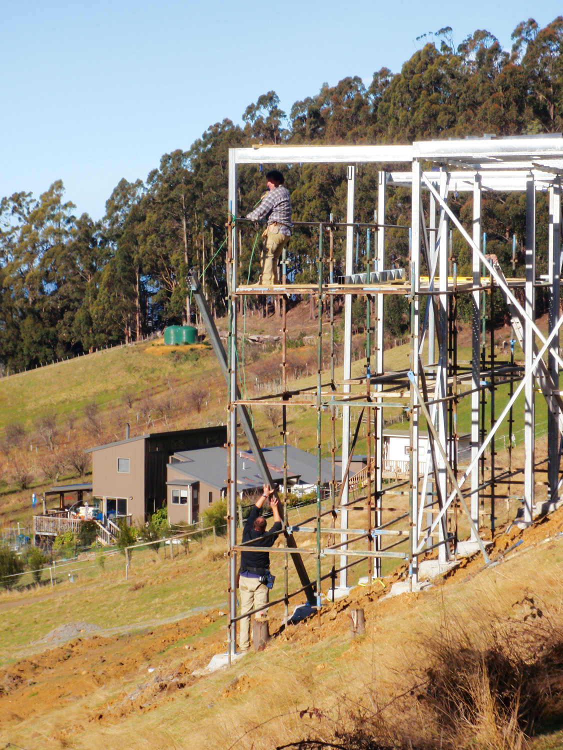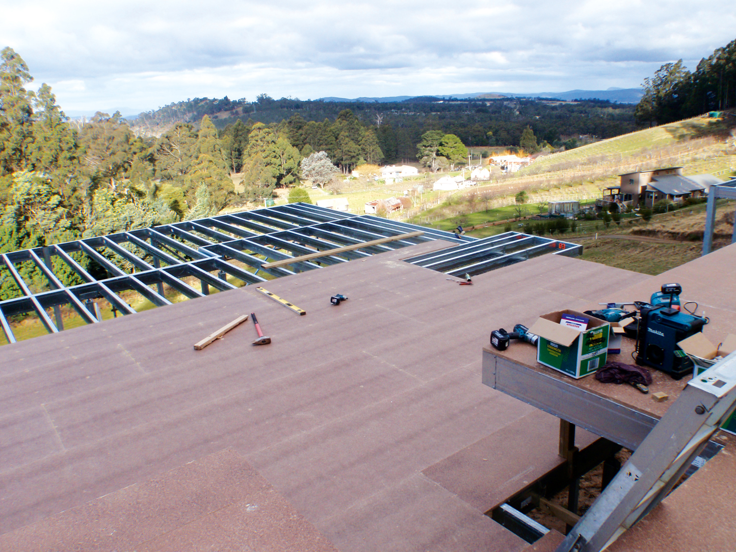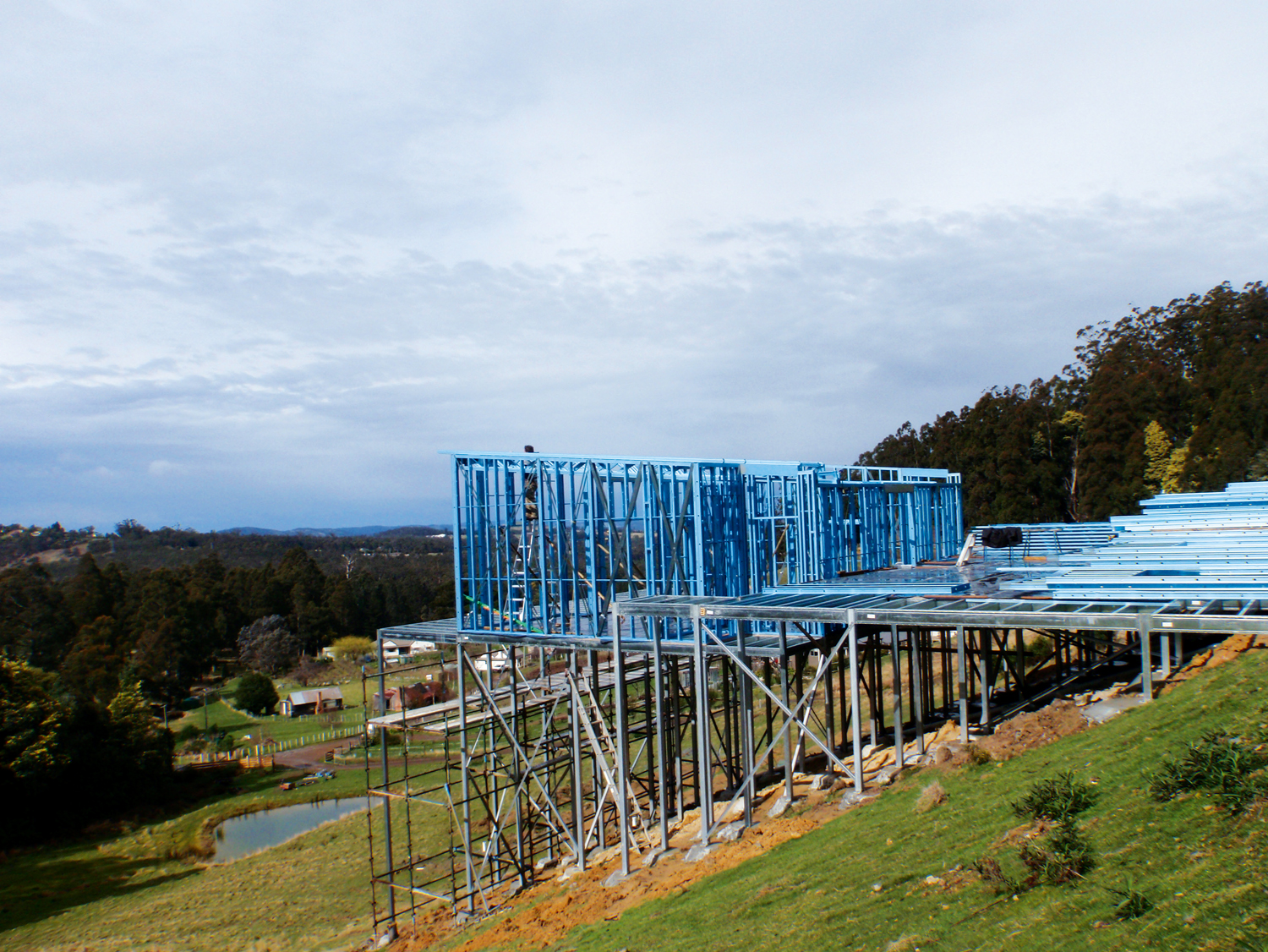 Jason opted for a kit home from Blusteel Homes because he wanted to enjoy the experience of building his own home from scratch. The site is steep, overlooking an orchard, with distant views of the Derwent River and Port Arthur. The steep site presented no problem for the Boxspan flooring system, which eliminates the need for cutting, filling and compaction. This means there is no need to repair the site with expensive landscaping and retaining walls, an often overlooked cost in the building process.