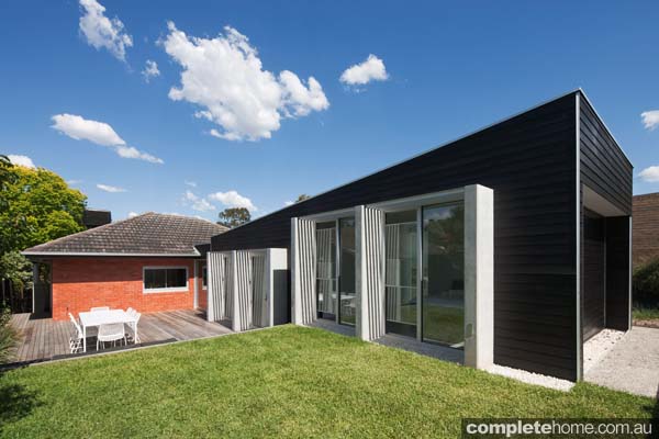 Although on a limited budget, the clients chose to invest in key materials such as the hardwood timber cladding and precisely cast in-situ concrete blades. These concrete blades contrast with the black shell and frame openings to the north of the new addition, creating deep reveals that provide an element of shading and visual privacy to the bedroom at the western extremity.