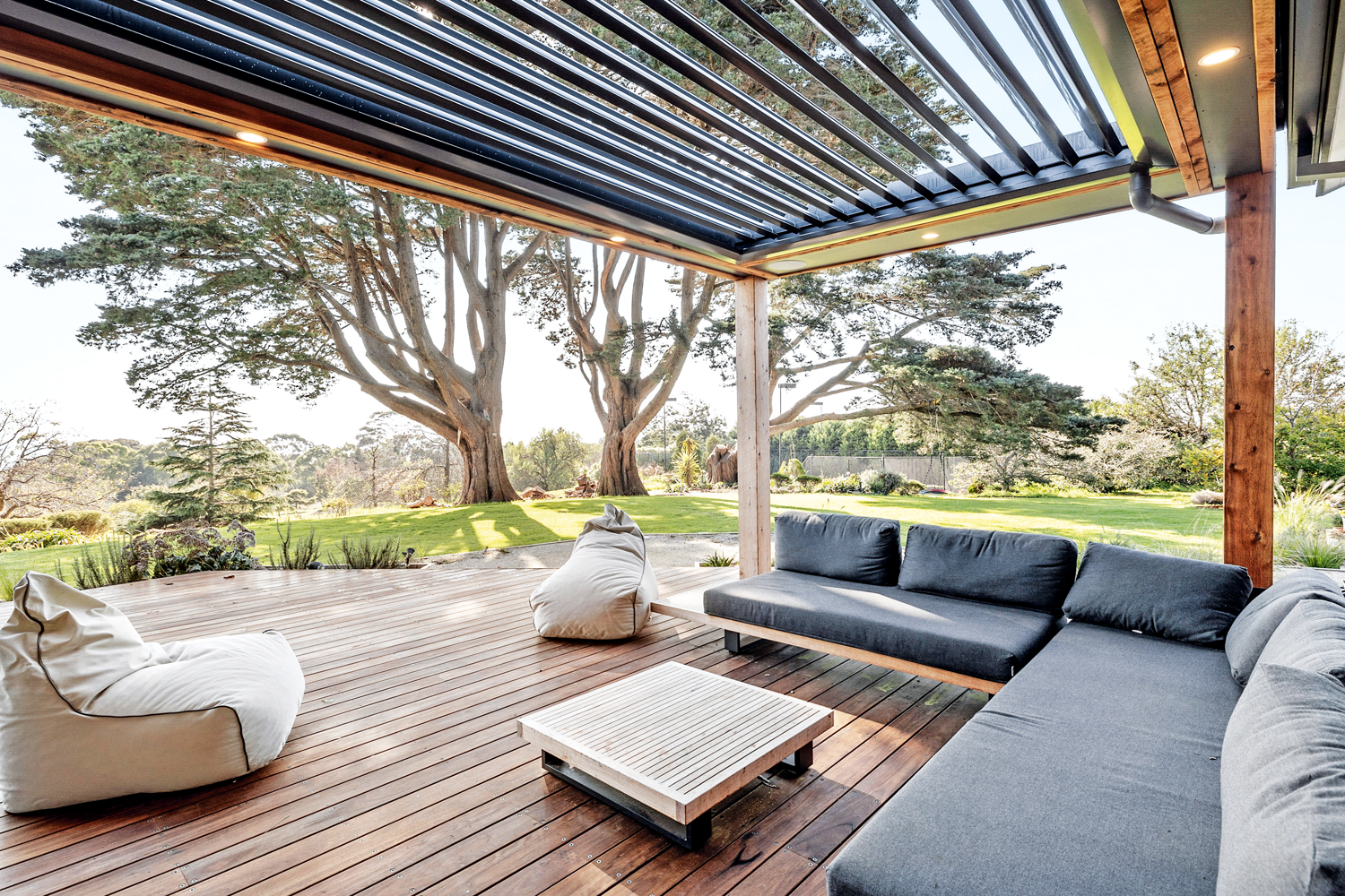 And when the homeowners feel like venturing outside, they can relax in style on the outdoor patio, complete with yard views, a Vergola louvre roof and oversized lounges that look all too tempting to sink into.