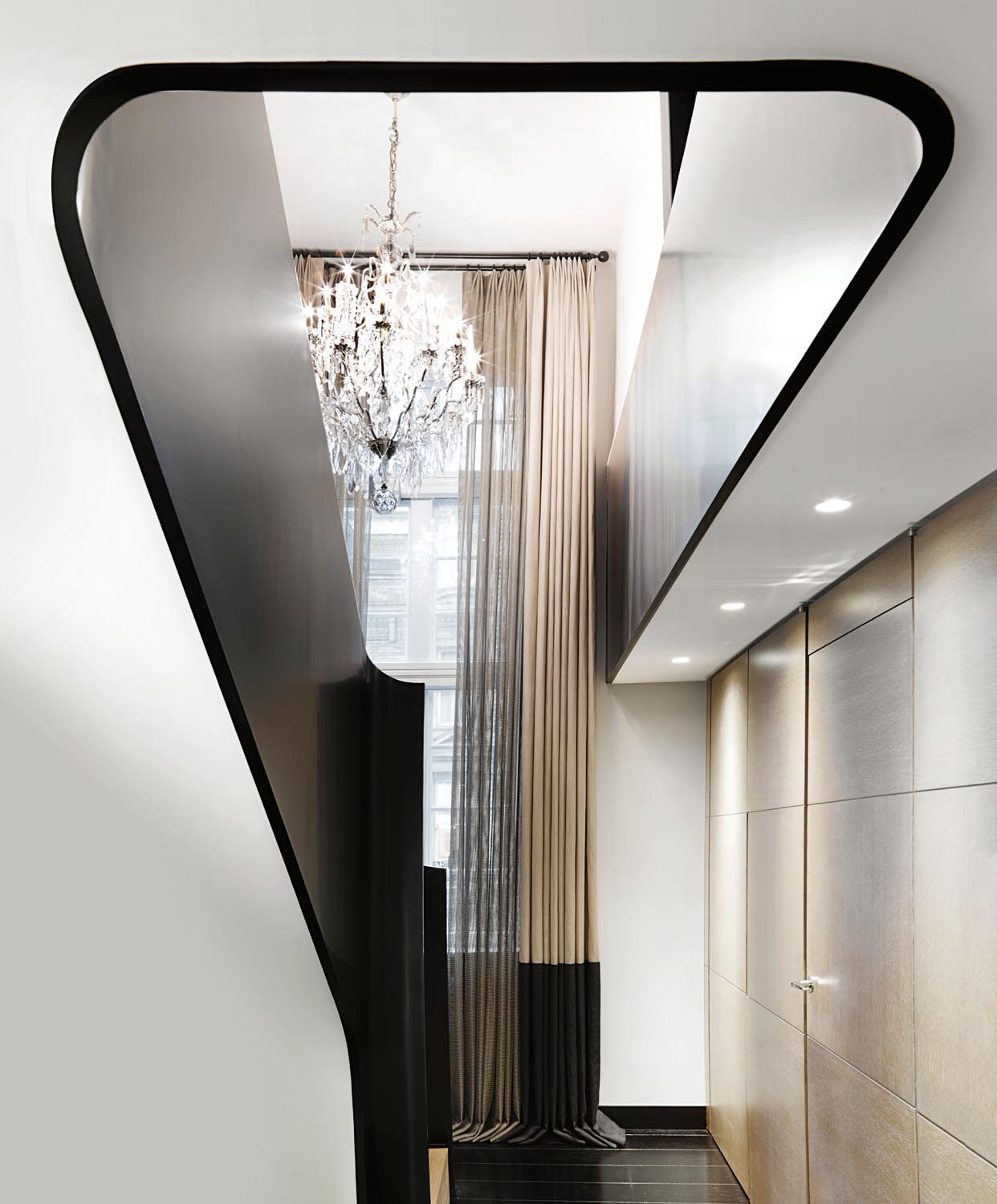 The redesign of the home, which spans an impressive 2500 square feet, encompasses four bedrooms and three bathrooms that all focus on neutral shades of black and white along with textural materials like glass, hardwood floors and a focus on curves — evident in the architectural, bespoke metal staircase and furniture selections.