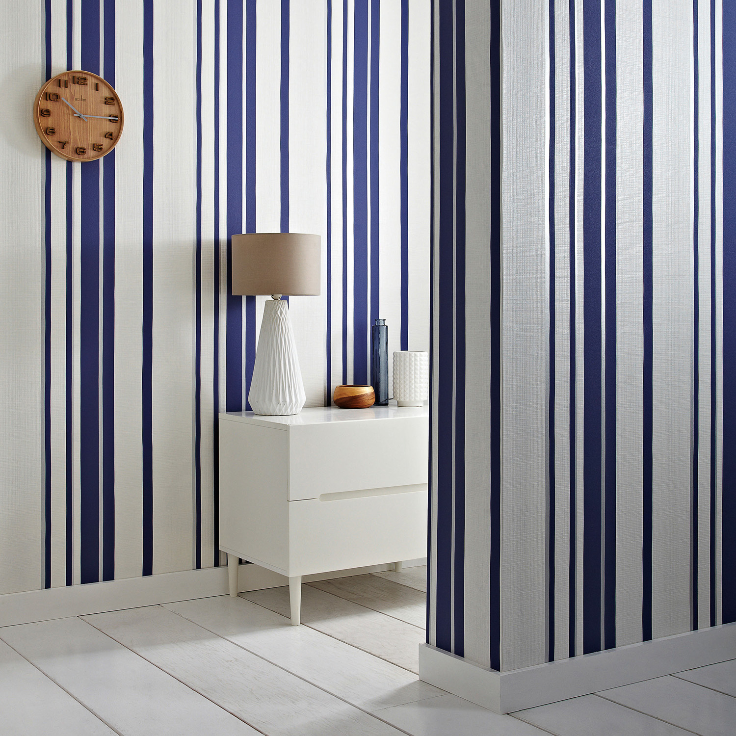 Expand a small space or create the illusion of high ceilings with the Hoppen Stripe wallpaper in white and Prussian blue from GRAHAM & BROWN. The white stripes are textured with a linen effect while a subtle silver strip lines either side, making it pop. grahambrown.com/uk