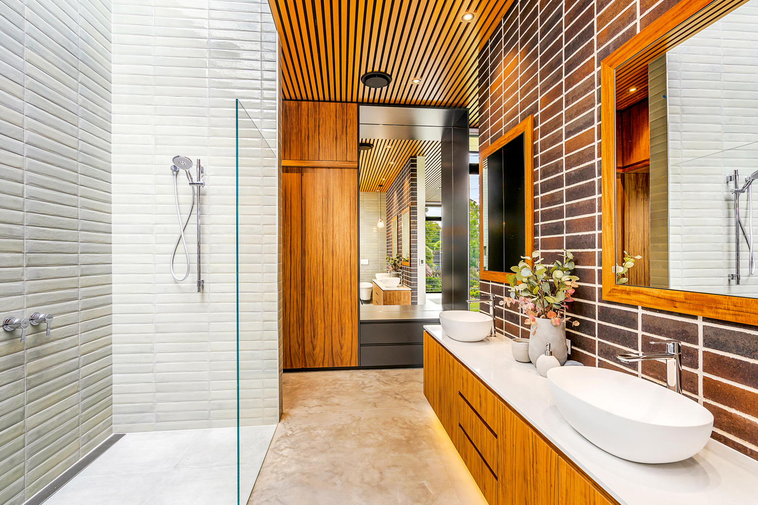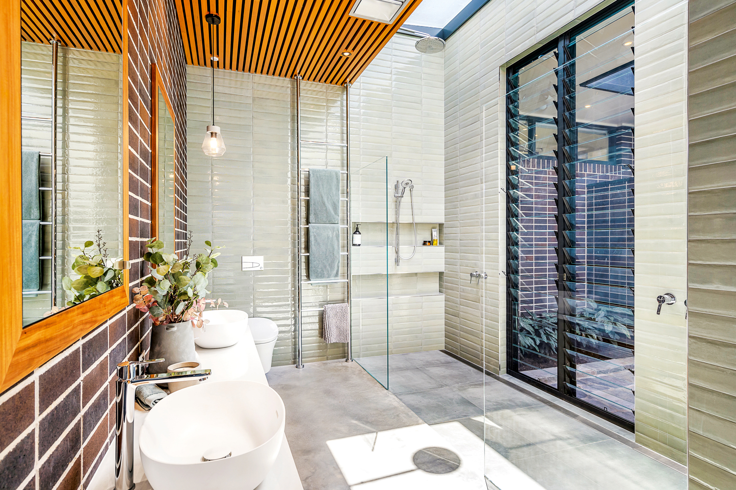 Clerestory glazing draws light into the dwelling, and stackbond brickwork extends from the outside to the inside of the home, which helps harmonise indoor-outdoor living.