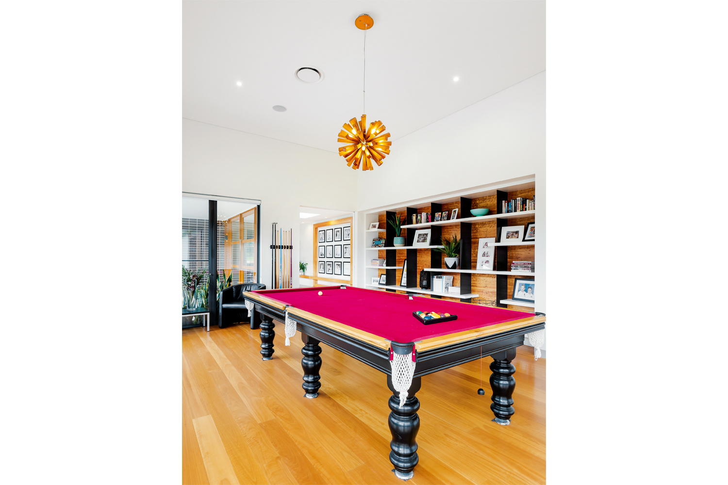 The rumpus area is spacious, with abstract pendant lights illuminating the room, creating cosy comfort for relaxation and entertainment. The staggered black and white shelving highlights a feature wall within the space and is sunken to personalise the area.